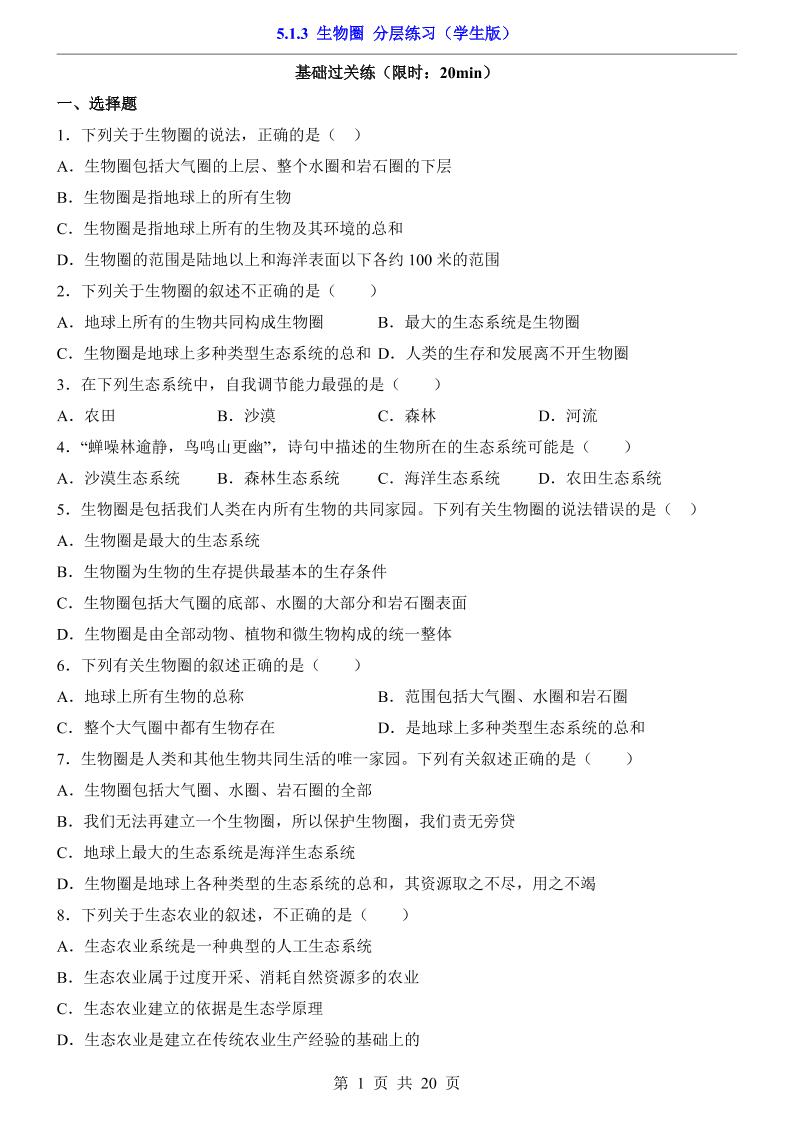5.1.3 生物圈(分层练习)