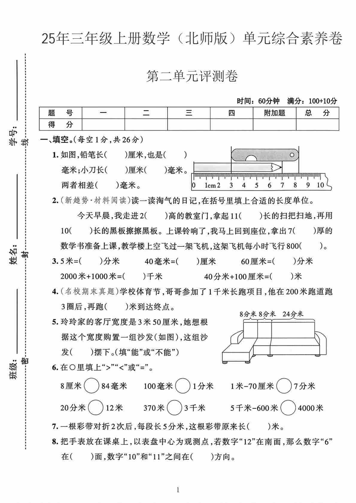 25年三年级上册数学(北师版)第二单元综合素养评测卷