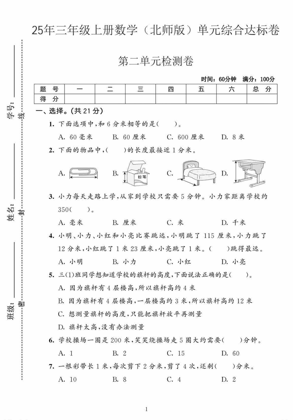 25年三年级上册数学(北师版)第二单元综合达标检测卷