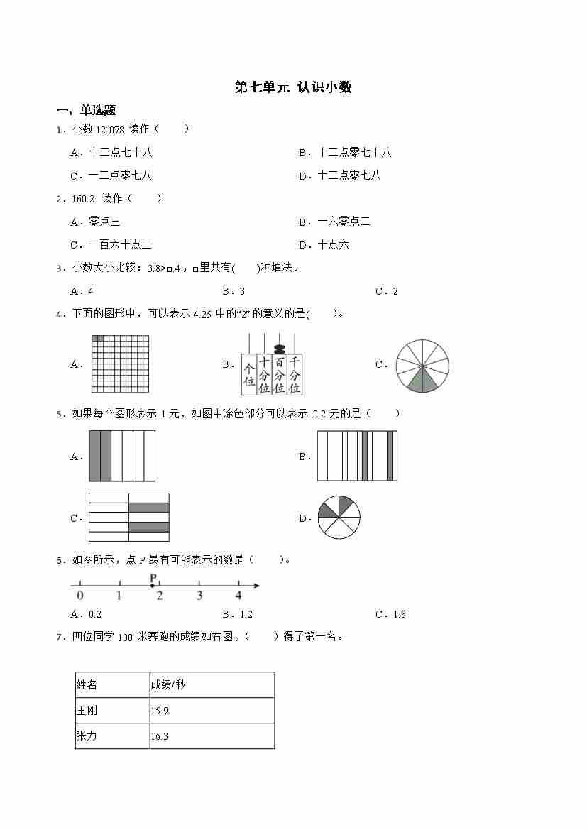 第七单元 认识小数(单元测试 基础卷) (A4版)