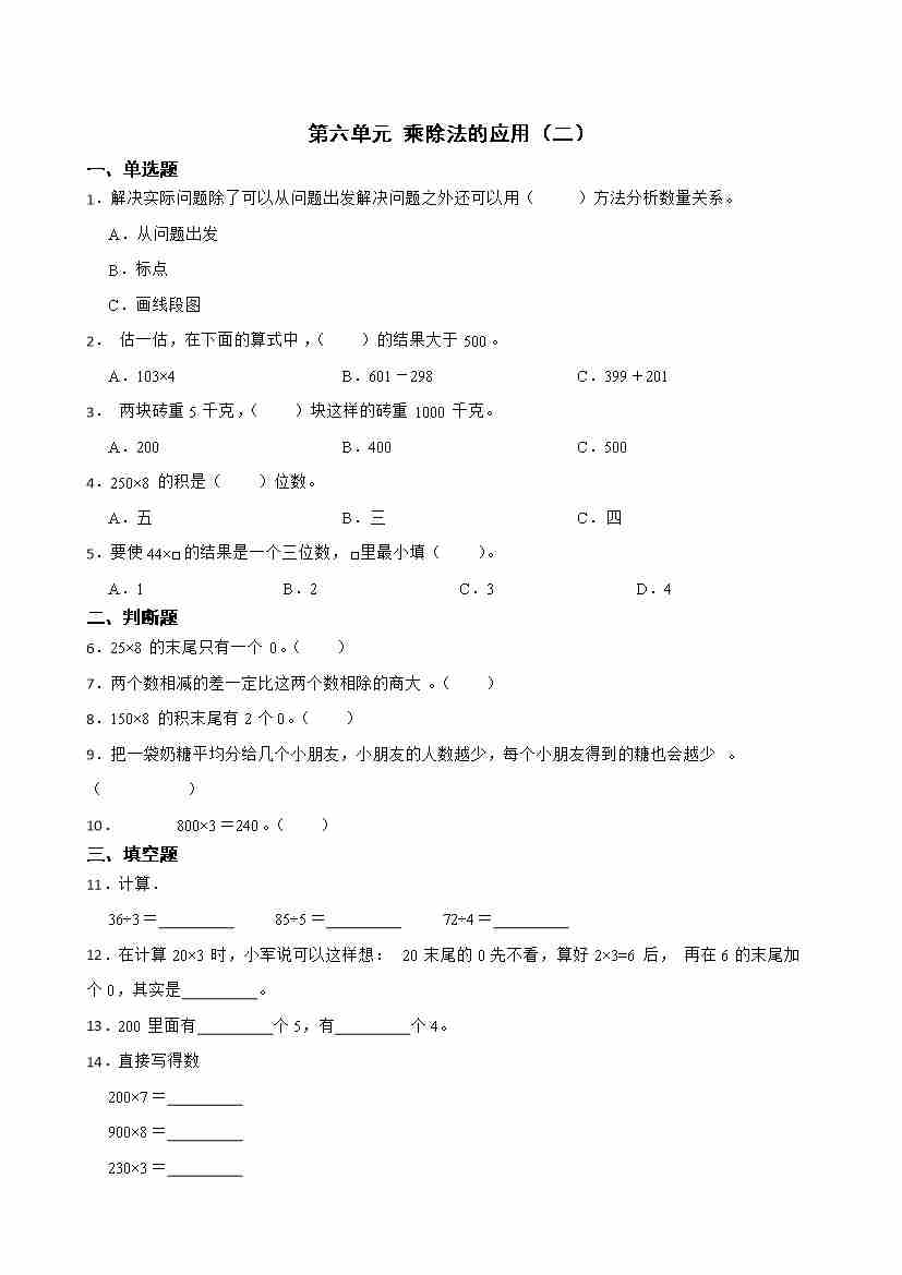 北师大版三上数学第六单元《乘除法的应用(二)》单元检测卷(含答案)