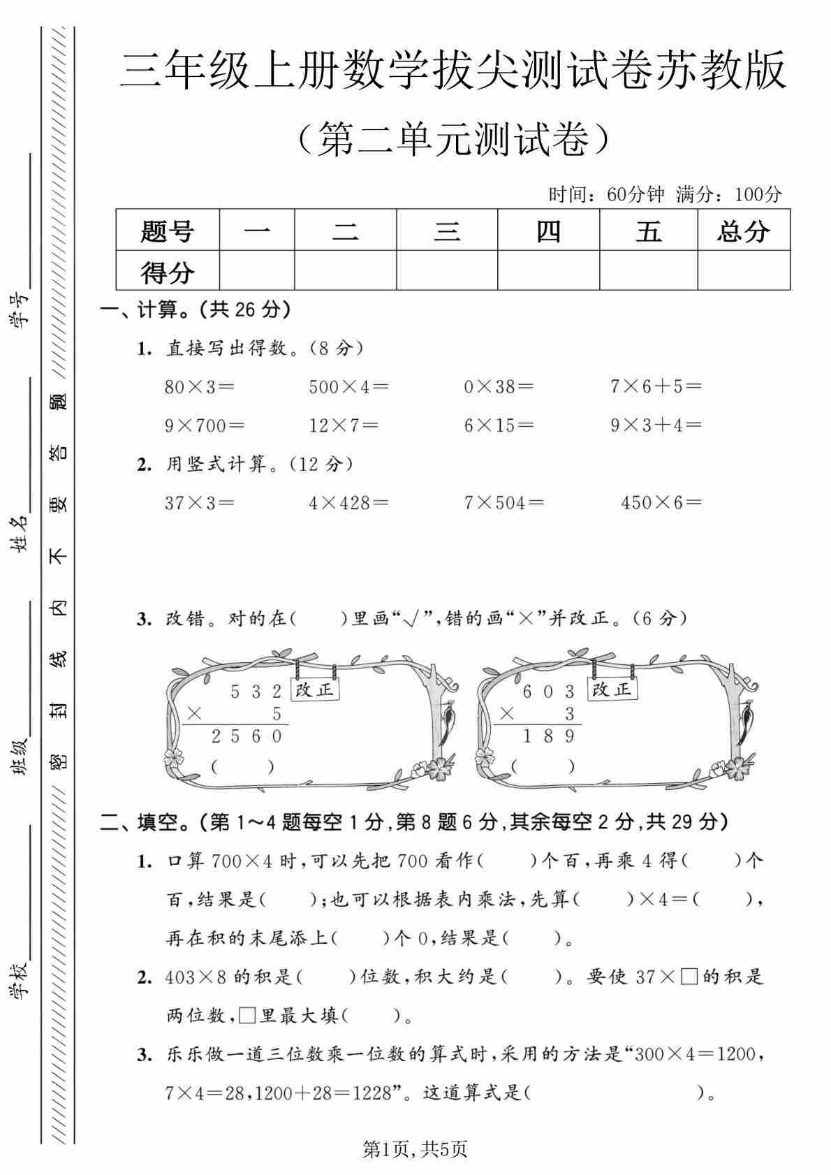 三(上)2025秋苏教版数学【第二单元拔尖测试卷1】