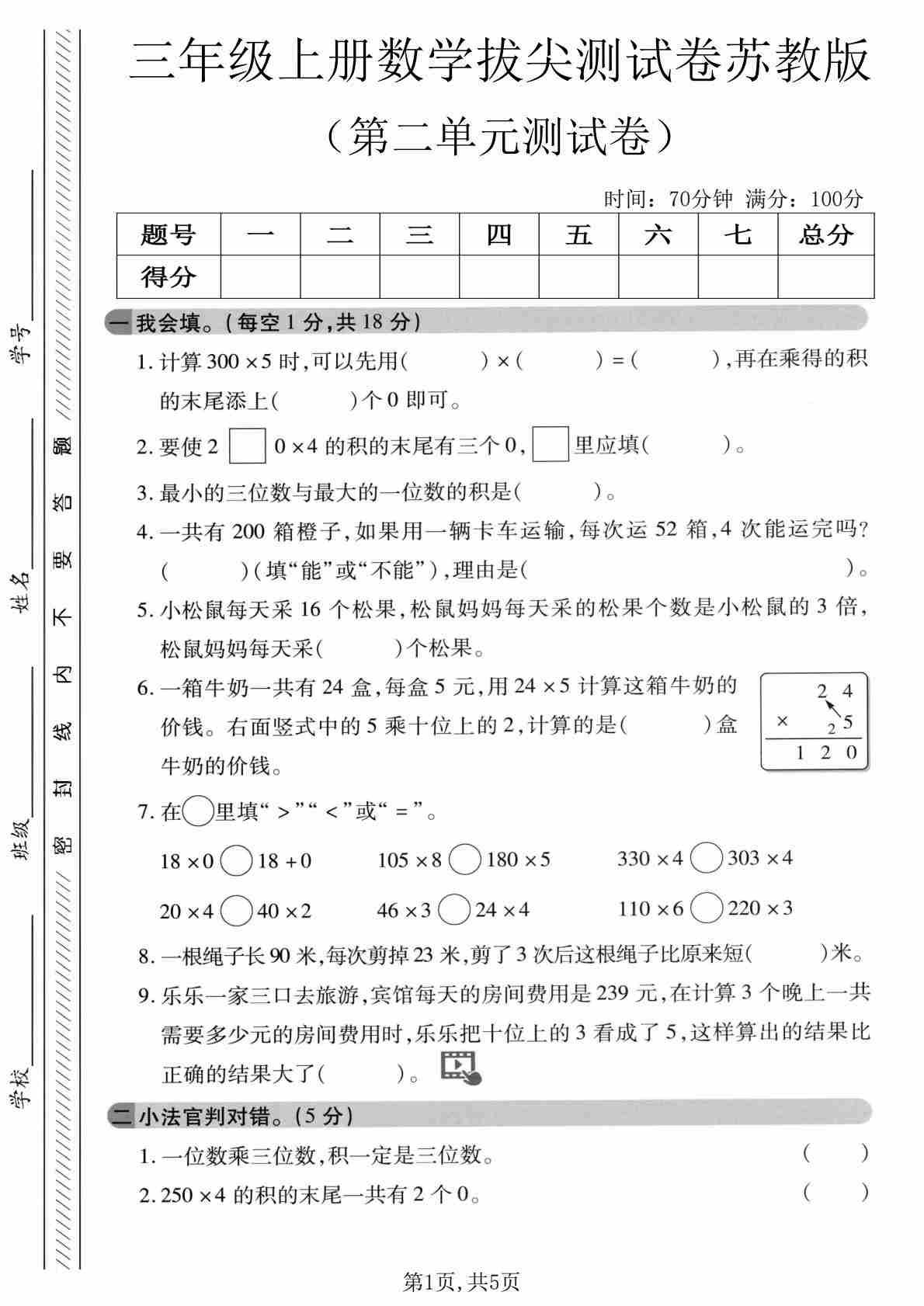 三年级(上)数学第五单元拔尖测试卷3《苏教版》