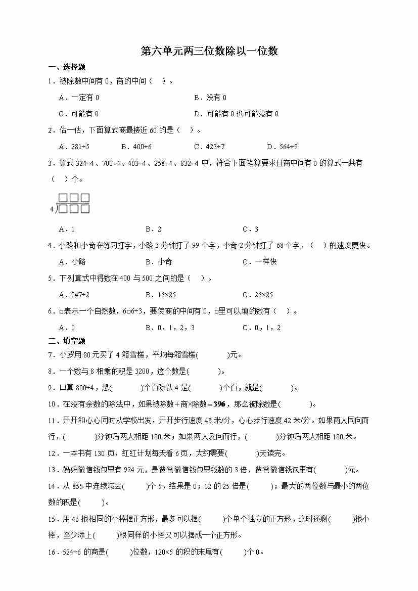 三年级(上)数学 第四单元测试卷《苏教版》3