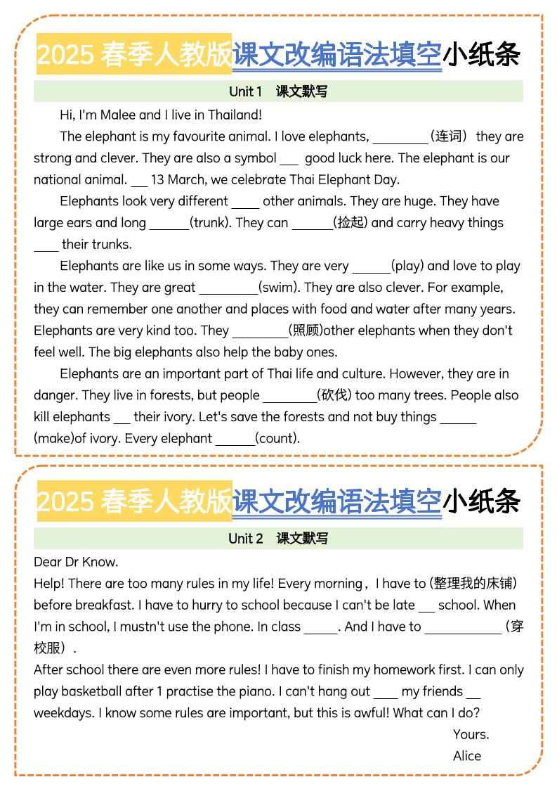 2025春季人教版课文改编语法填空小纸条(1)