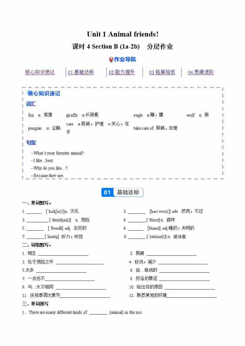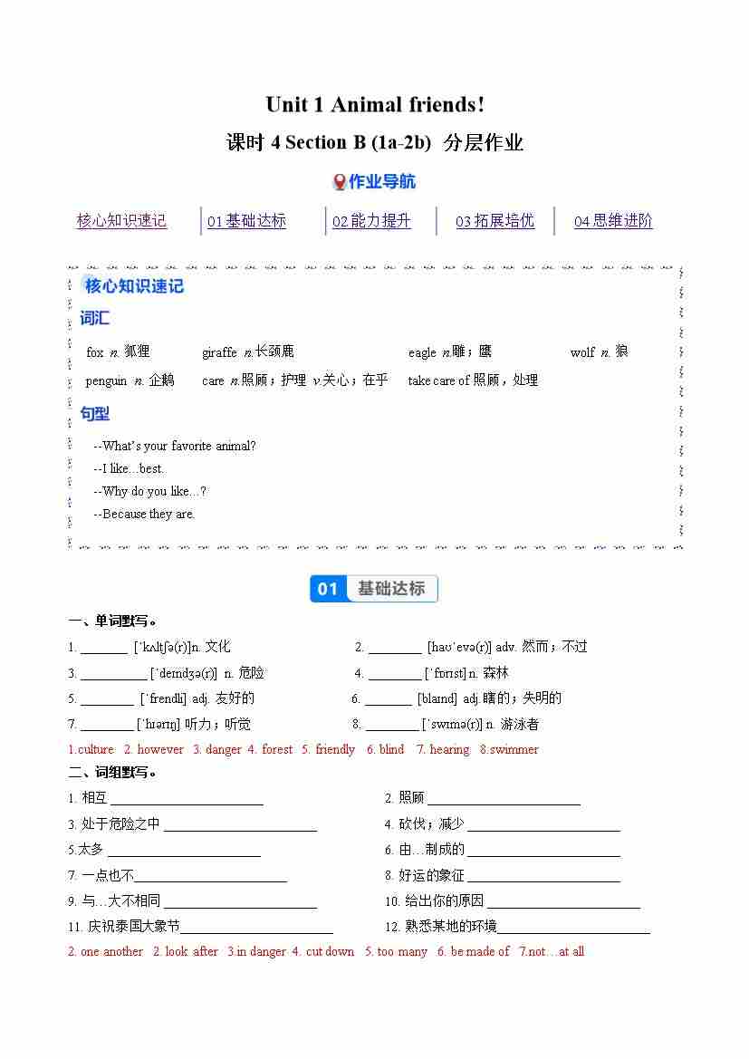 Unit 1 课时 4 Section B 1a-2b(分层作业)(解析版)