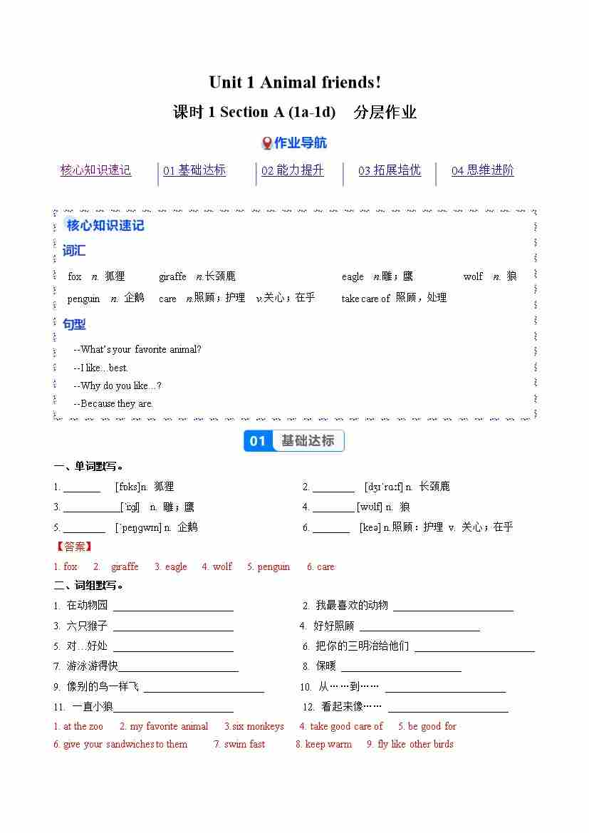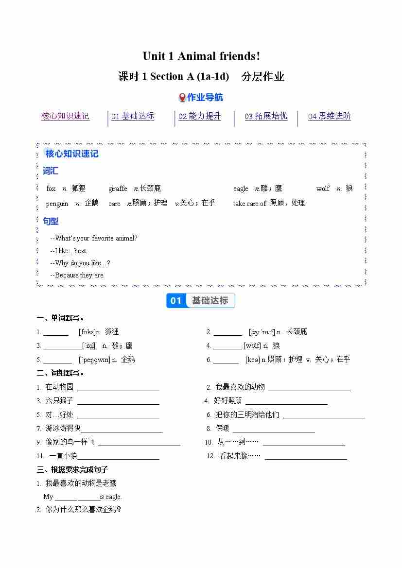 Unit 1 课时1 Section A 1a-1d(分层作业)(原卷版)