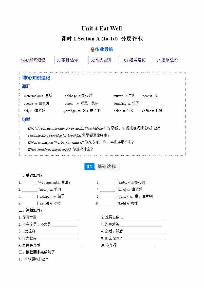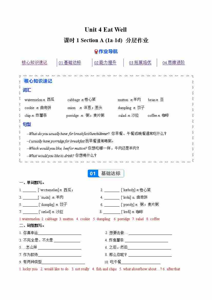 Unit 2 课时1 Section A 1a-1d(分层作业)(原卷版)
