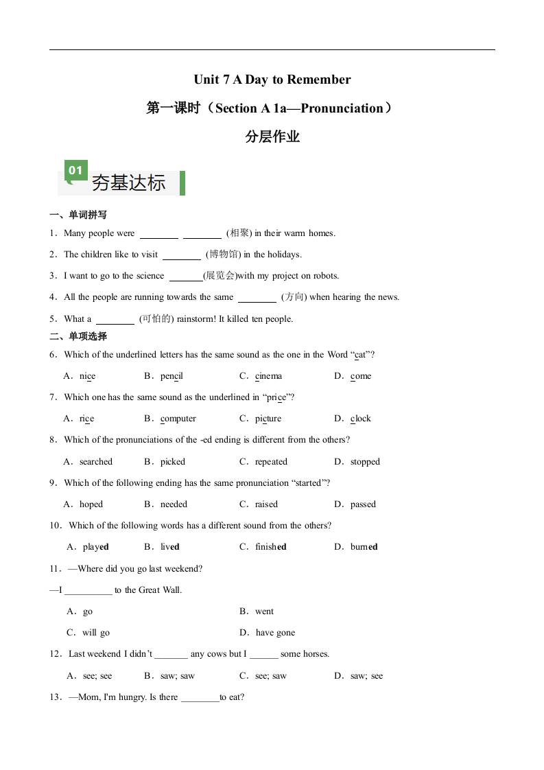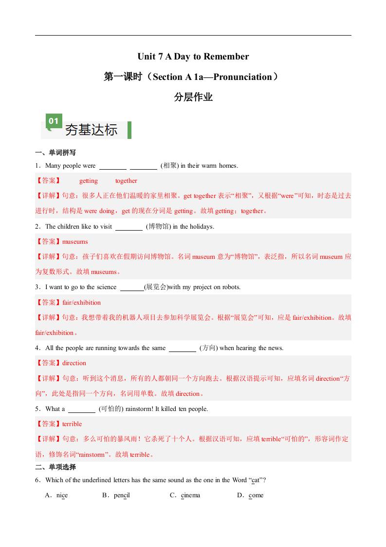 Unit 7 第1课时 Section A(1a-Pronunciation)(解析版)