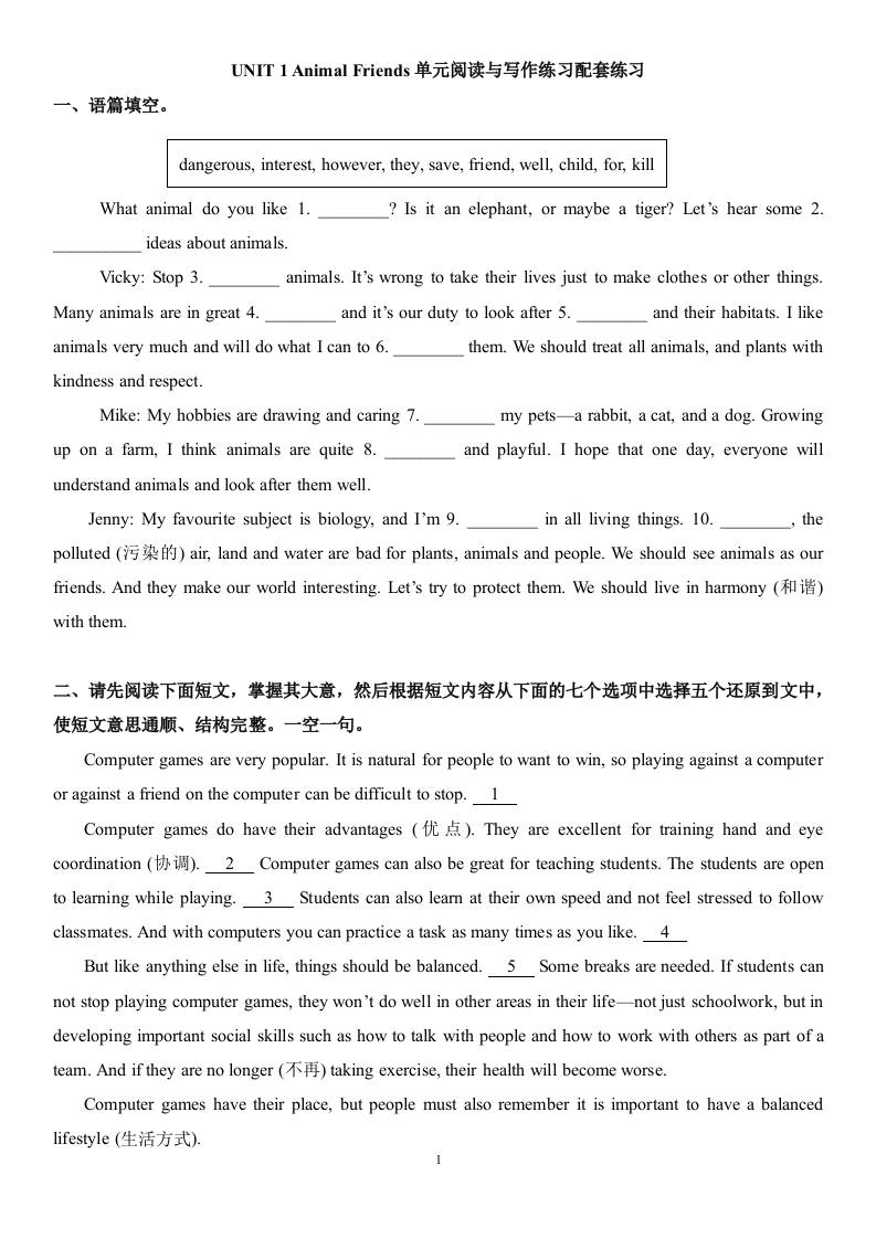 Unit 1 Animal Friends 动物(话题阅读精练)(原卷版)