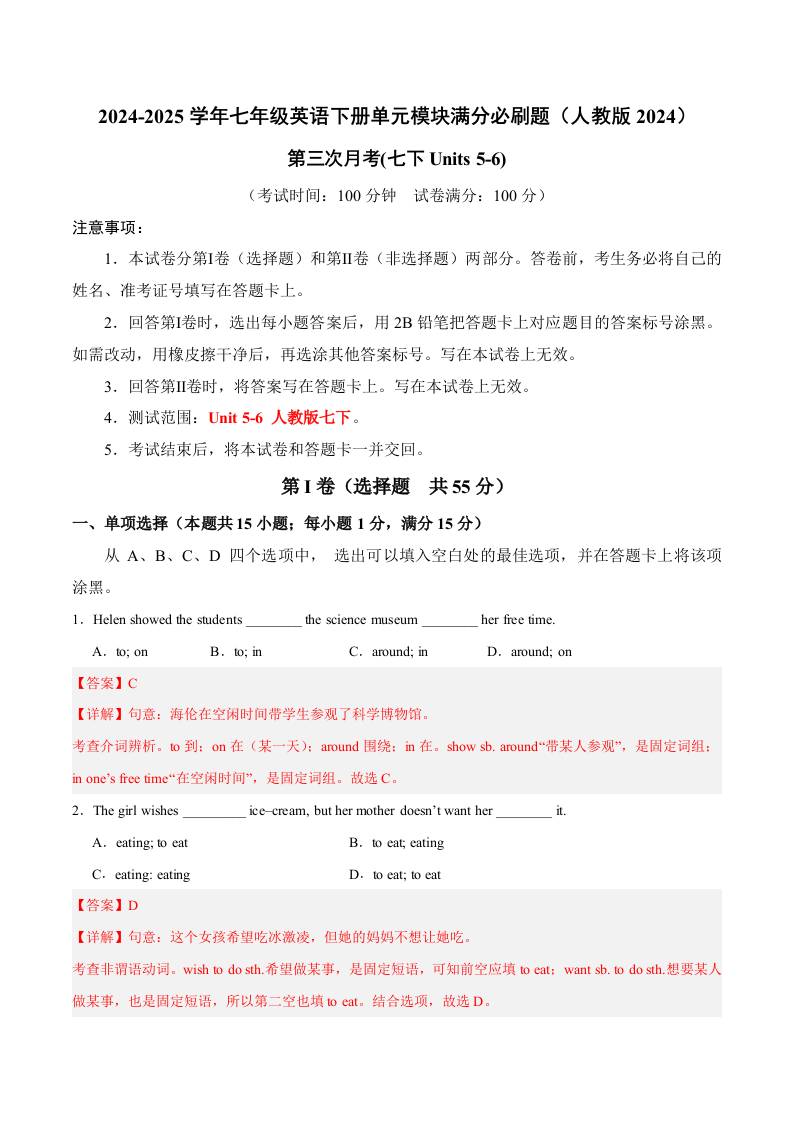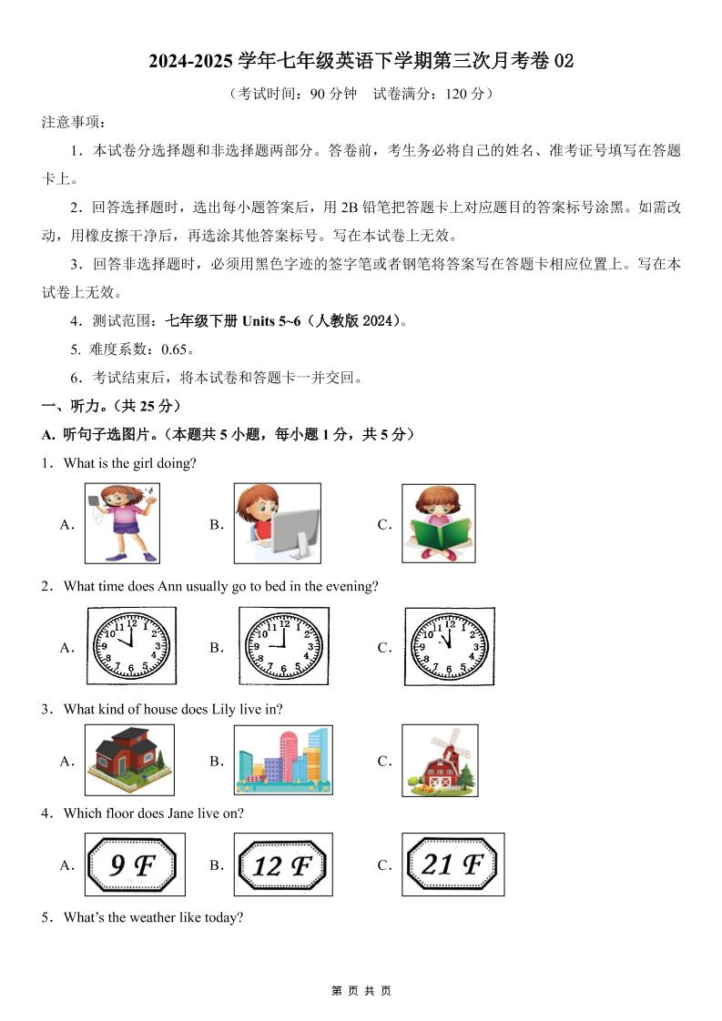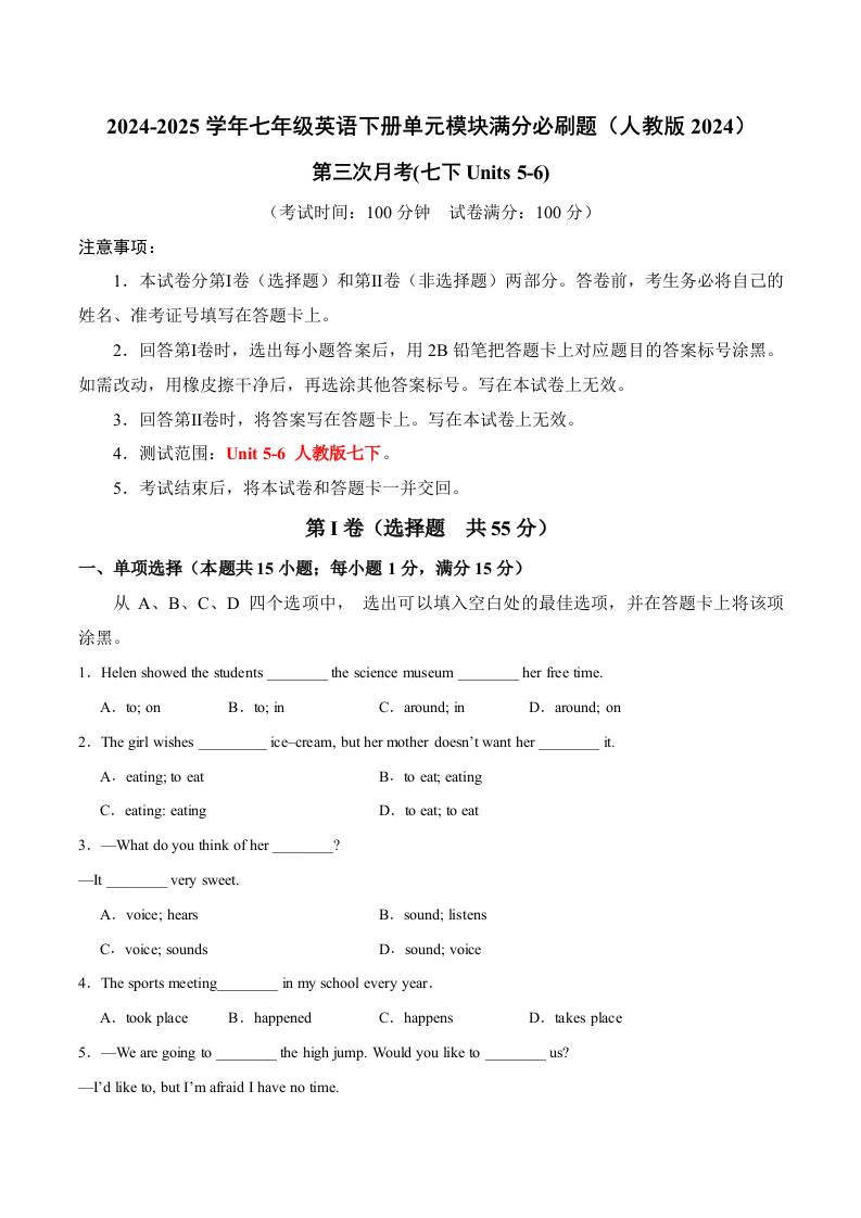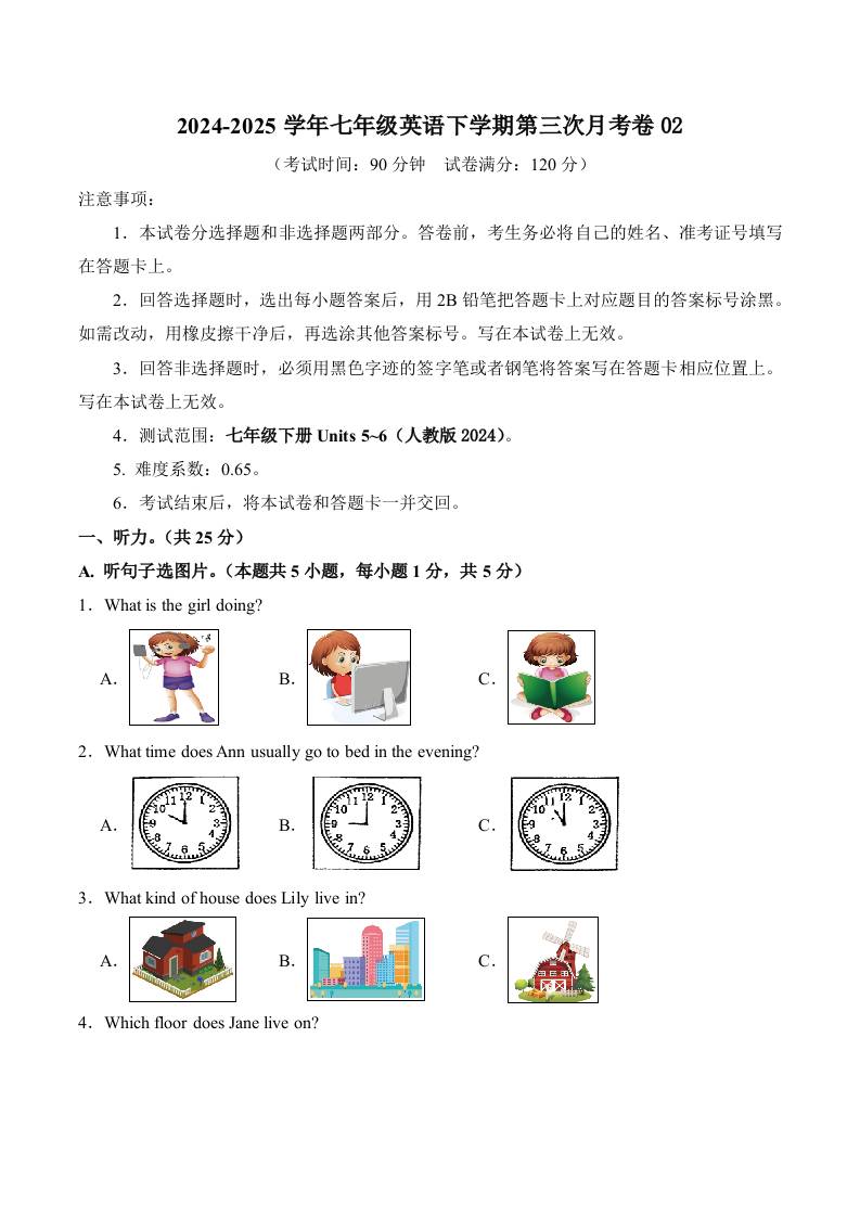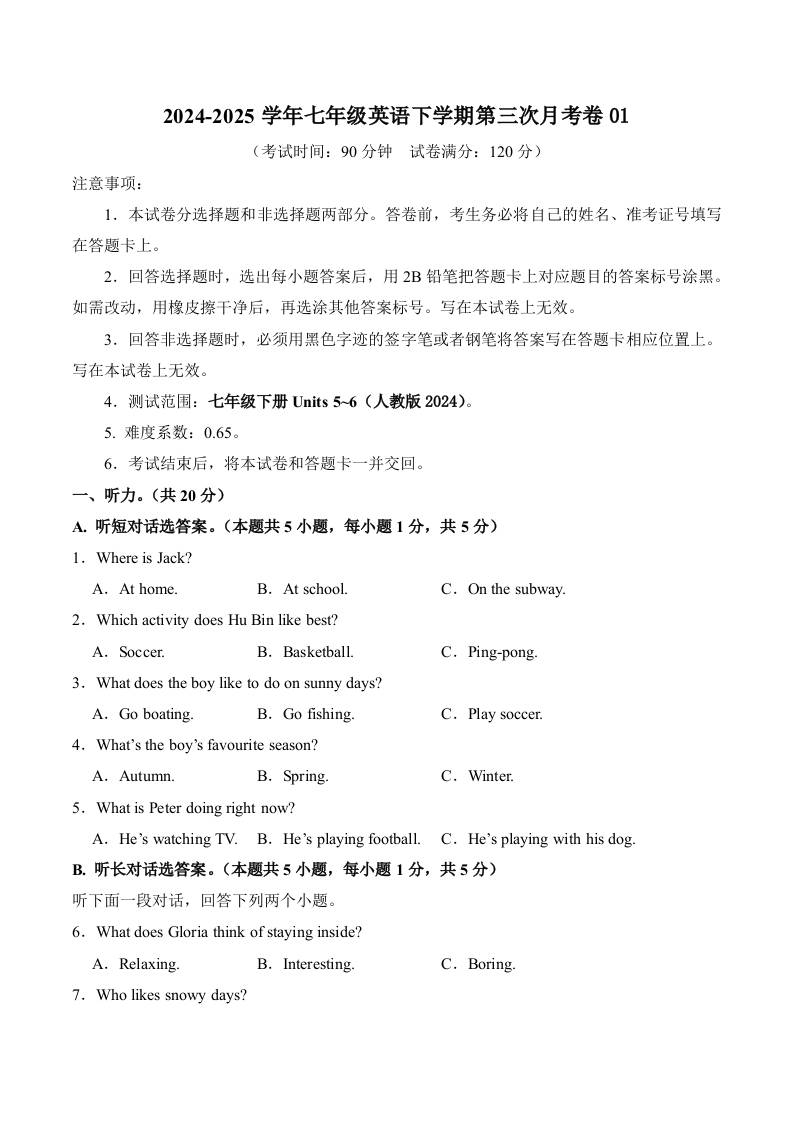 七下人教英语第三次月考卷01(考试版)【测试范围:Units 5~6】(人教版2024)_
