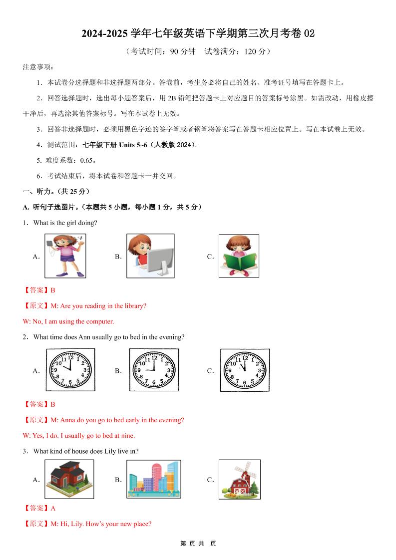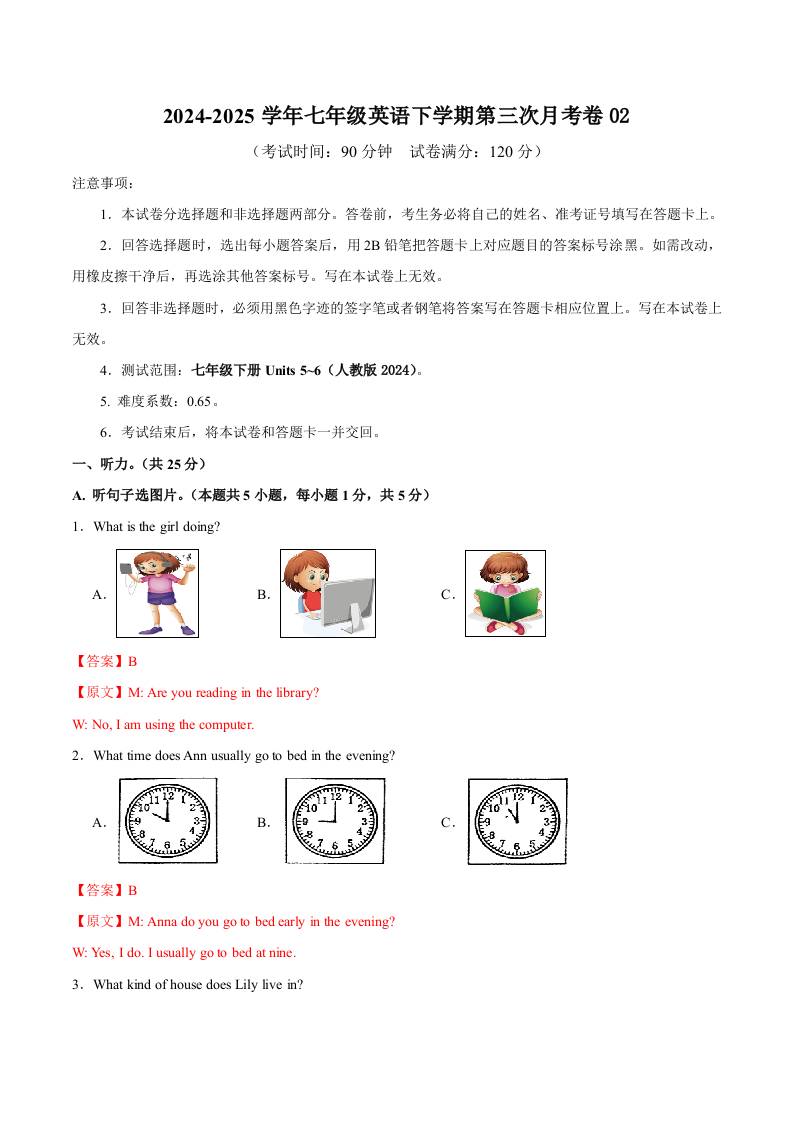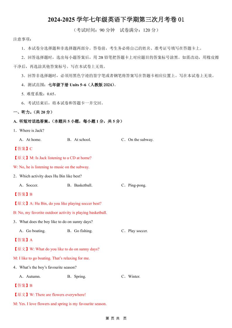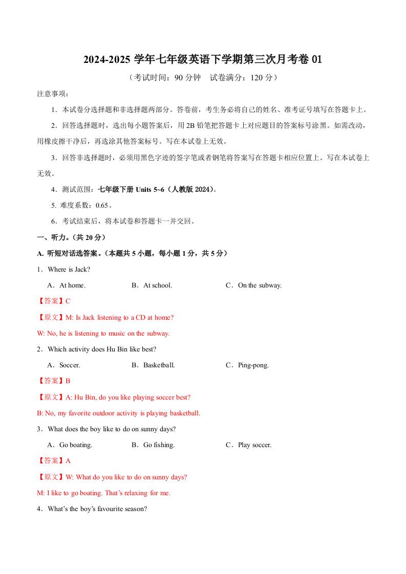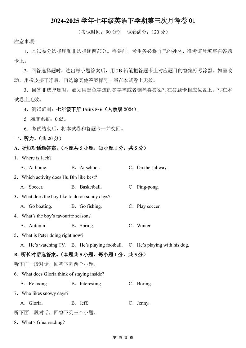 七下人教英语第三次月考卷01(考试版)【测试范围:Units 5~6】(人教版2024)_