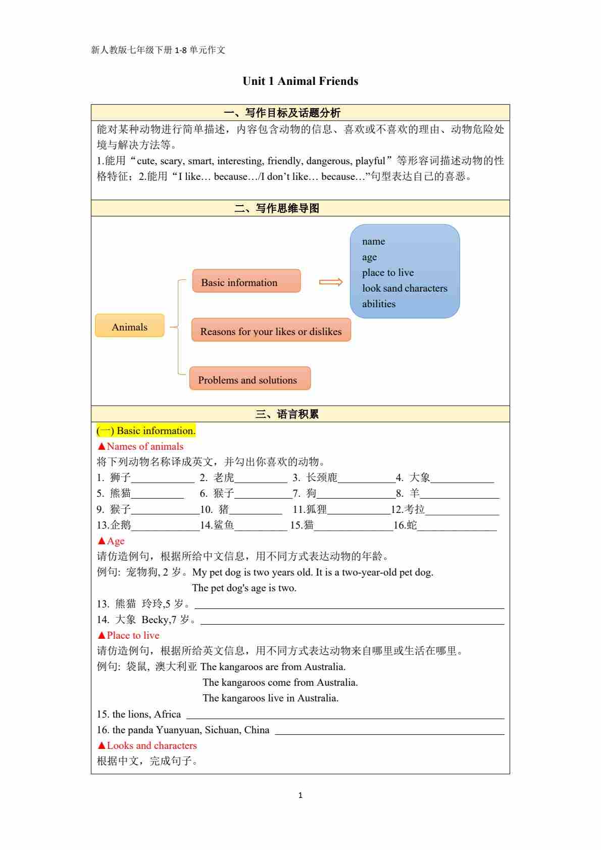 Unit 1 Animal Friends 动物朋友(单元写作精练)(原卷版)