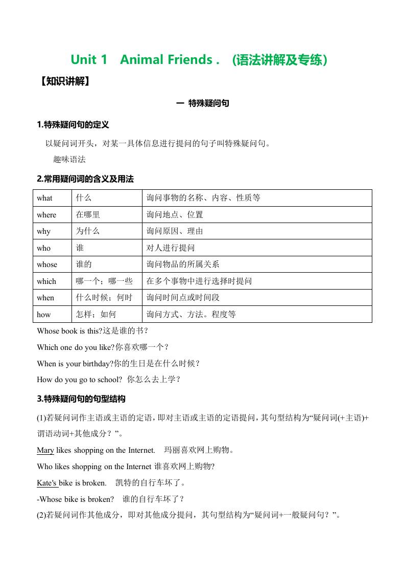 Unit 1 Animal Friends 特殊疑问句、形容词、名词单复数(单元核心语法精练)(解析版)
