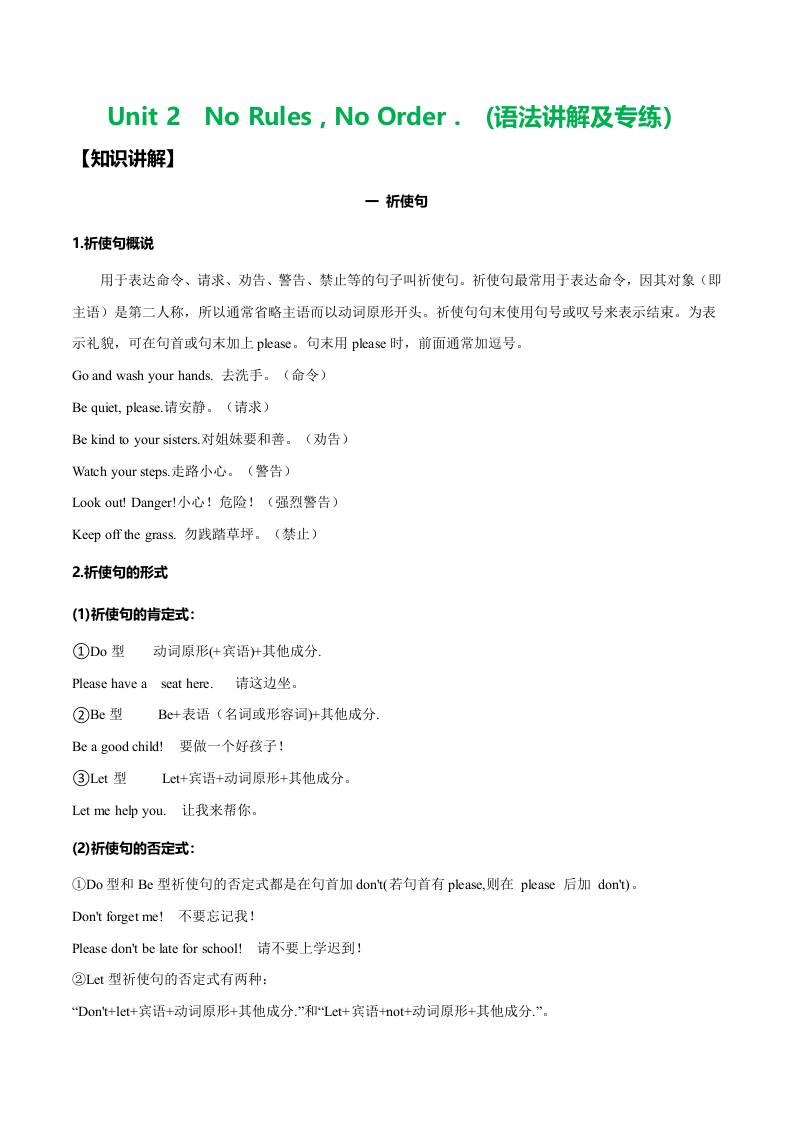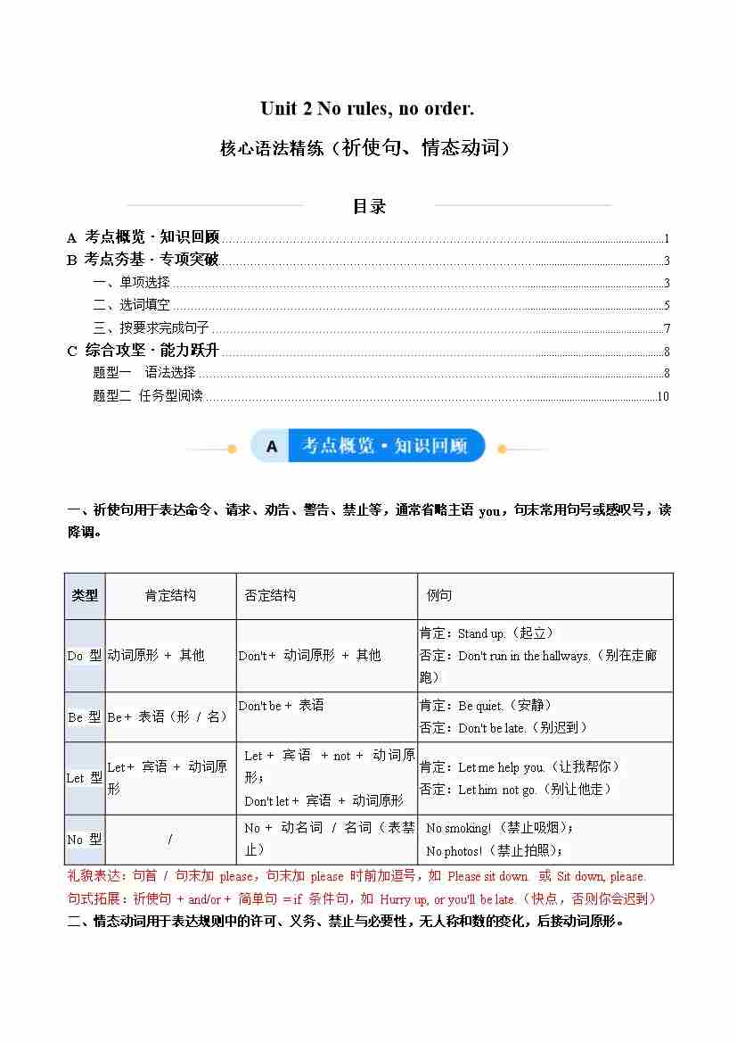Unit 2 No Rules, No Order 祈使句、情态动词(单元核心语法精练)(原卷版)