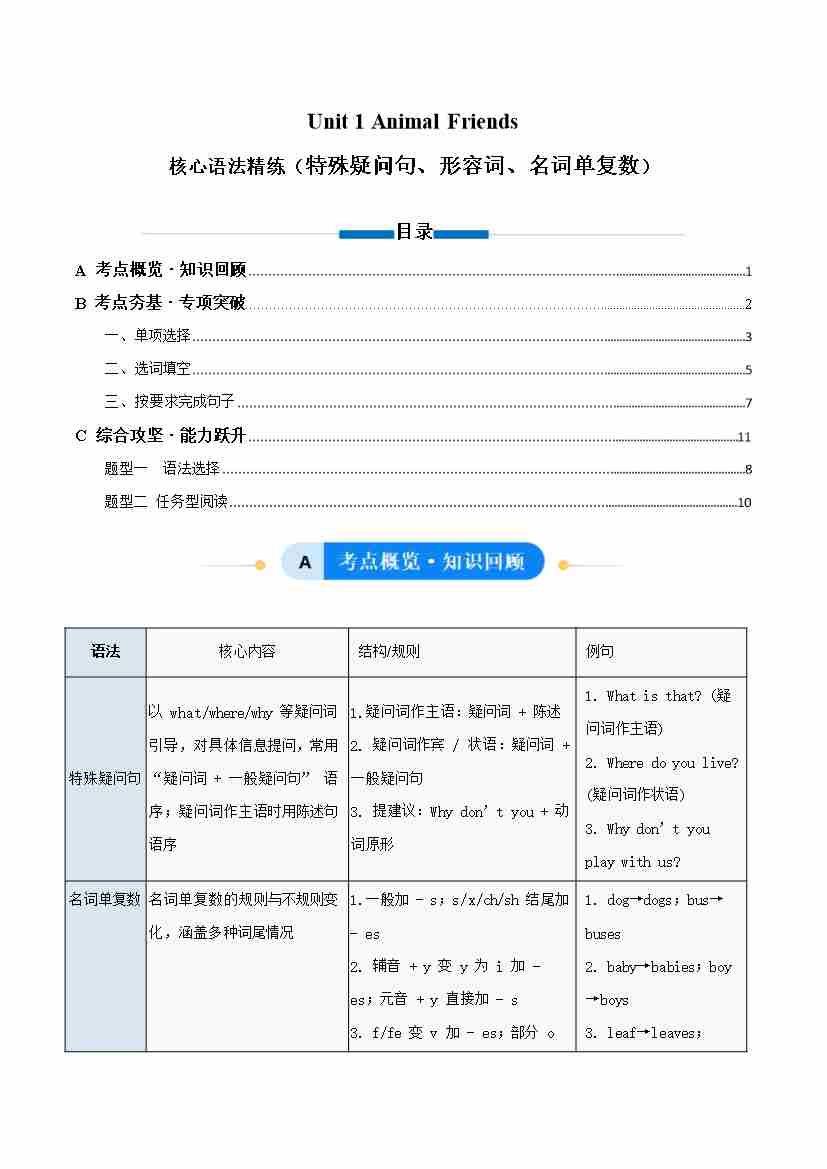 Unit 1 Animal Friends 特殊疑问句、形容词、名词单复数(单元核心语法精练)(原卷版)