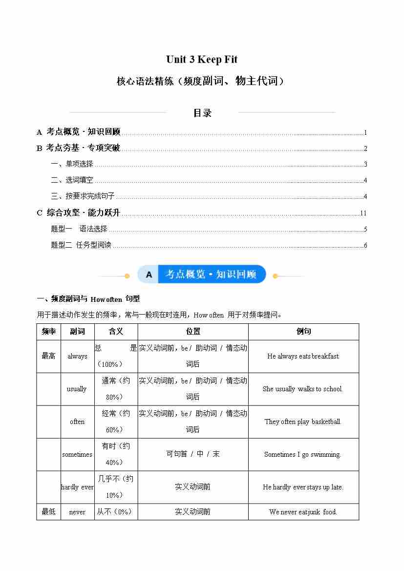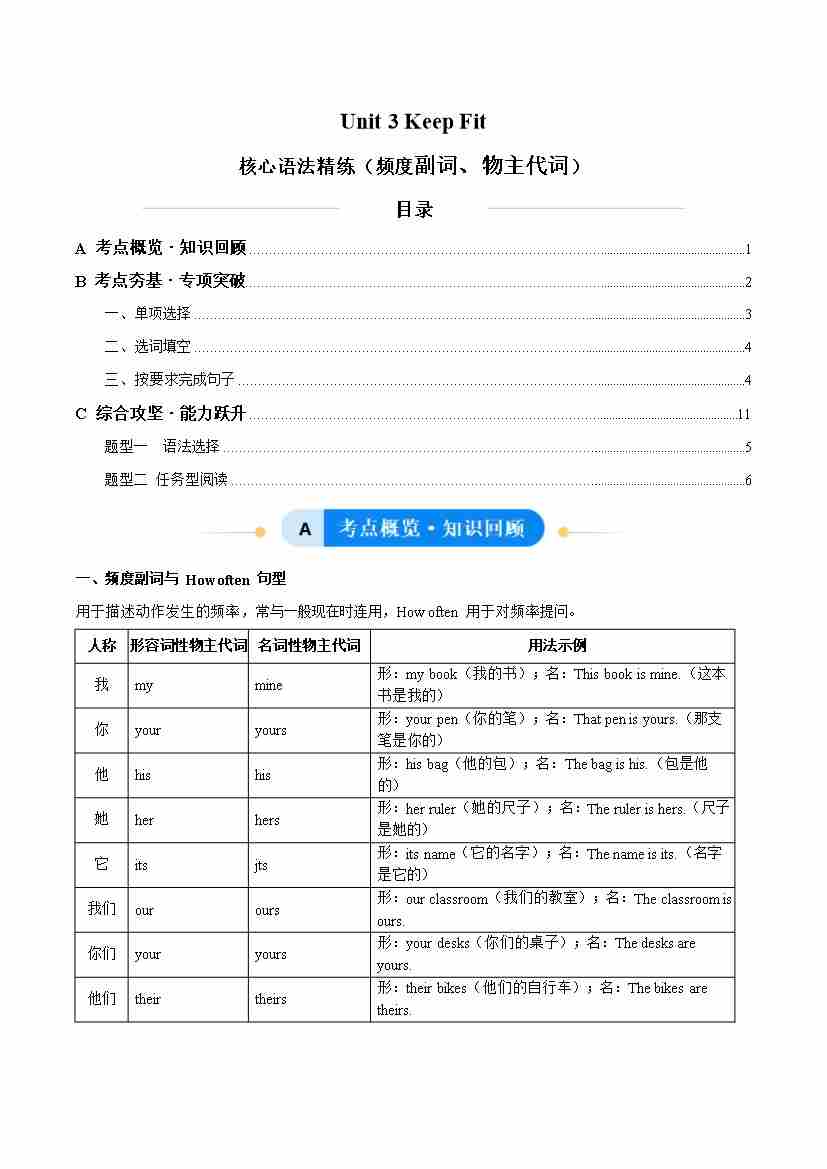 Unit 3 Keep Fit 频度副词、物主代词(单元核心语法精练)(原卷版)
