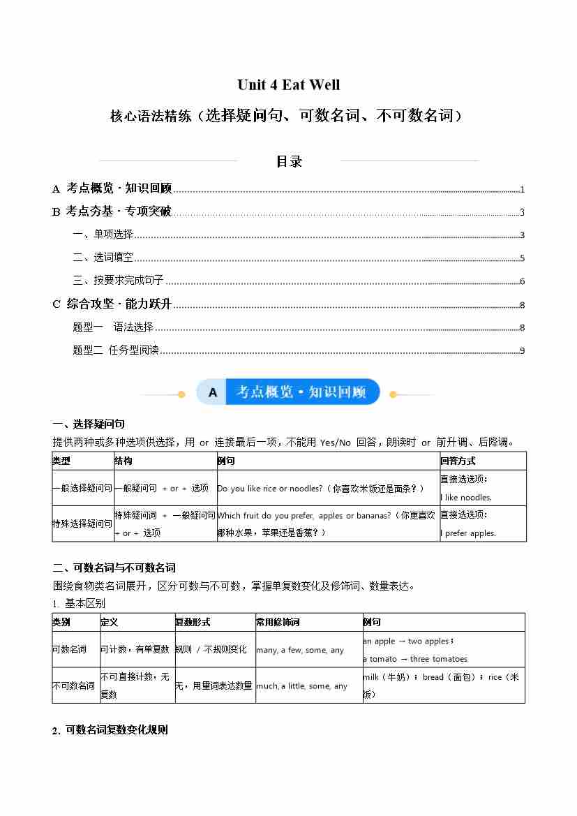 Unit 4 Eat Well 选择疑问句、可数名词、不可数名词 (单元核心语法精练)(原卷版)