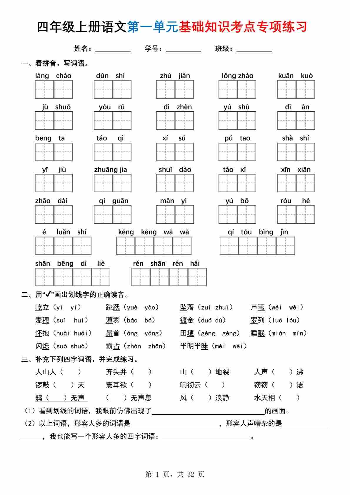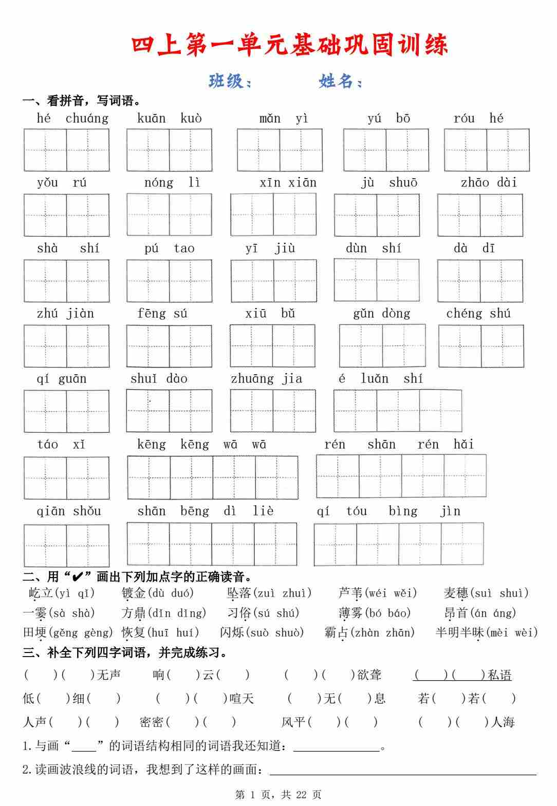 四(上)语文每课基础知识预习单
