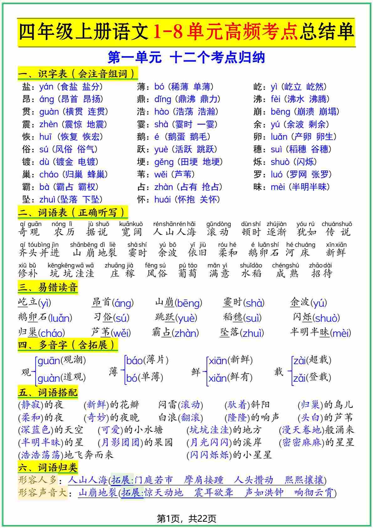 四上语文【1-8单元高频考点总结单(22页)】