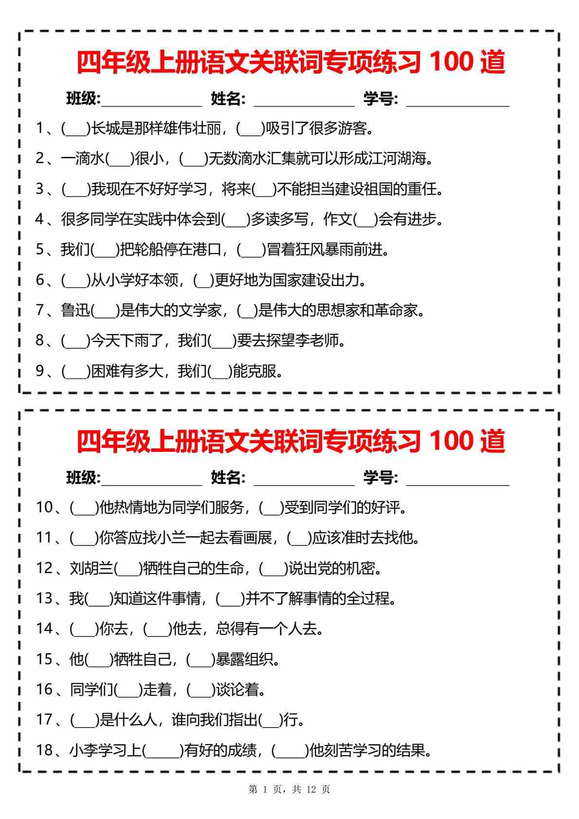 四上语文【关联词专项练习100道(含答案12页)】