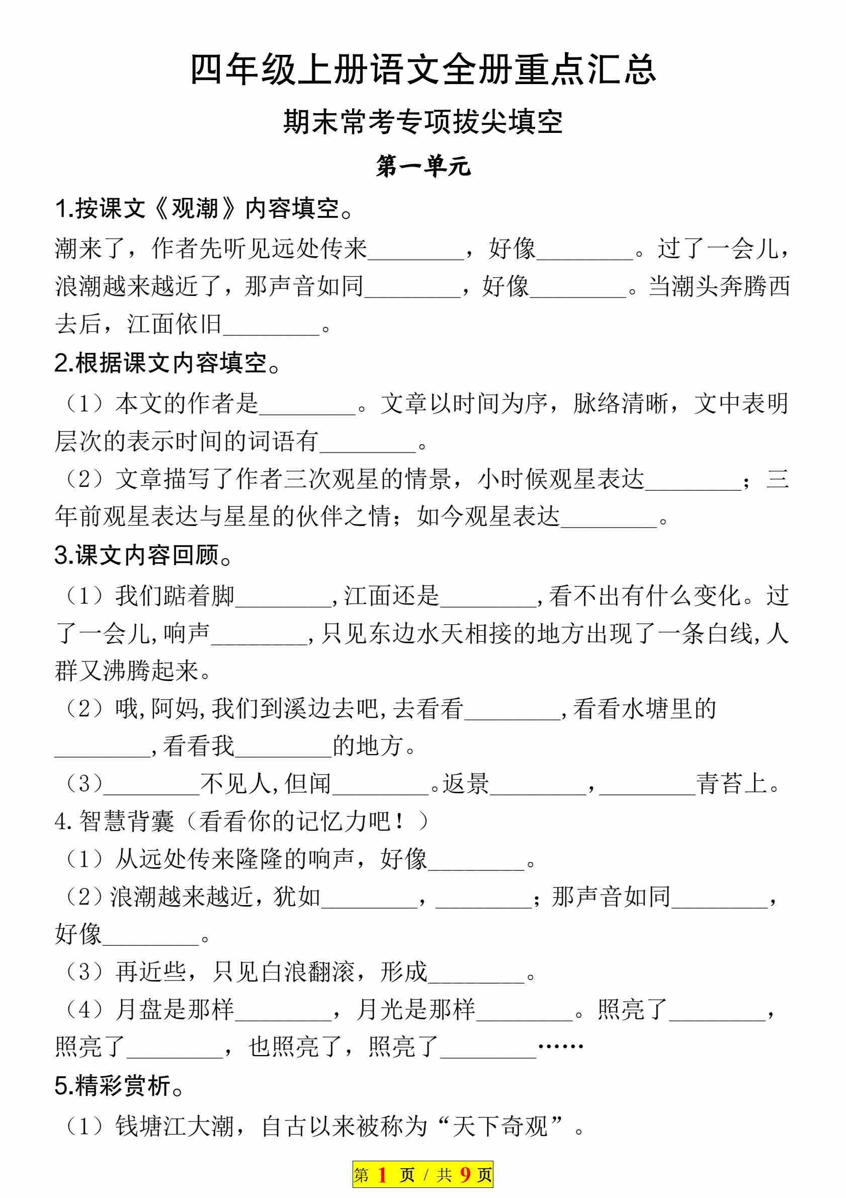 【地毯式复习】四年级上册语文1-8单元归类突破——词语