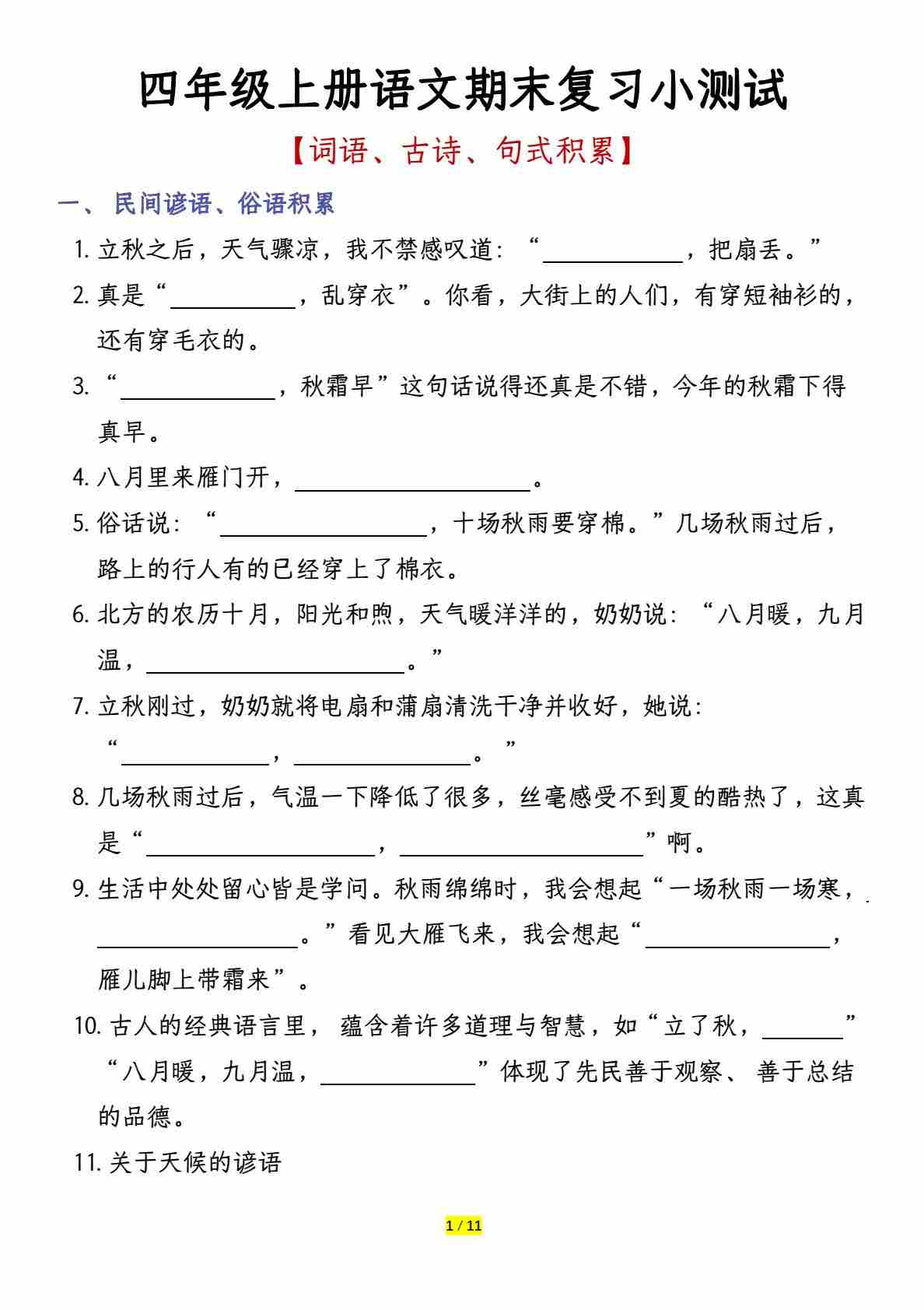 【词语、古诗、句式积累】四年级上册语文期末复习小测-含答案