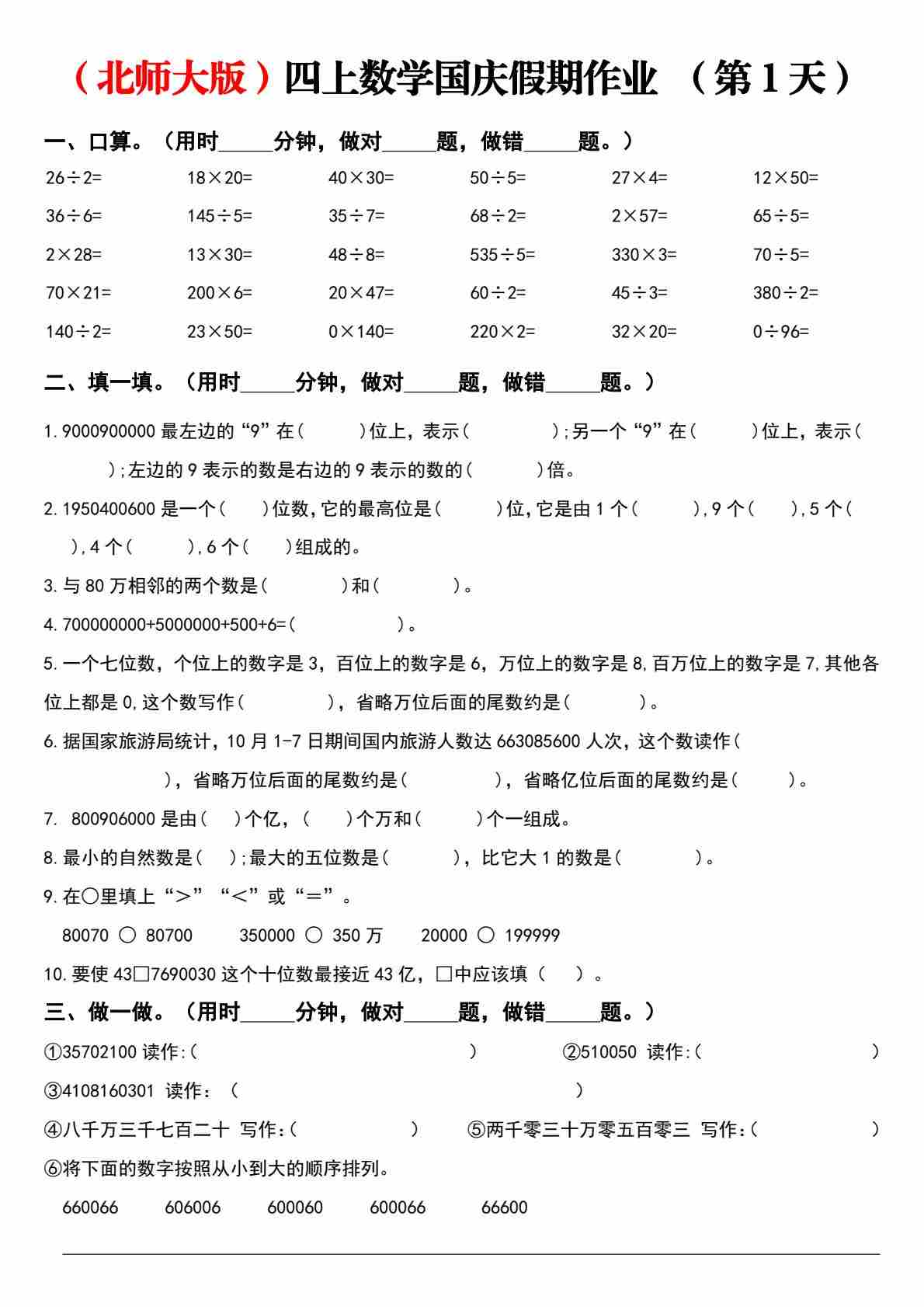 北师大版四上数学国庆假期作业【空白】