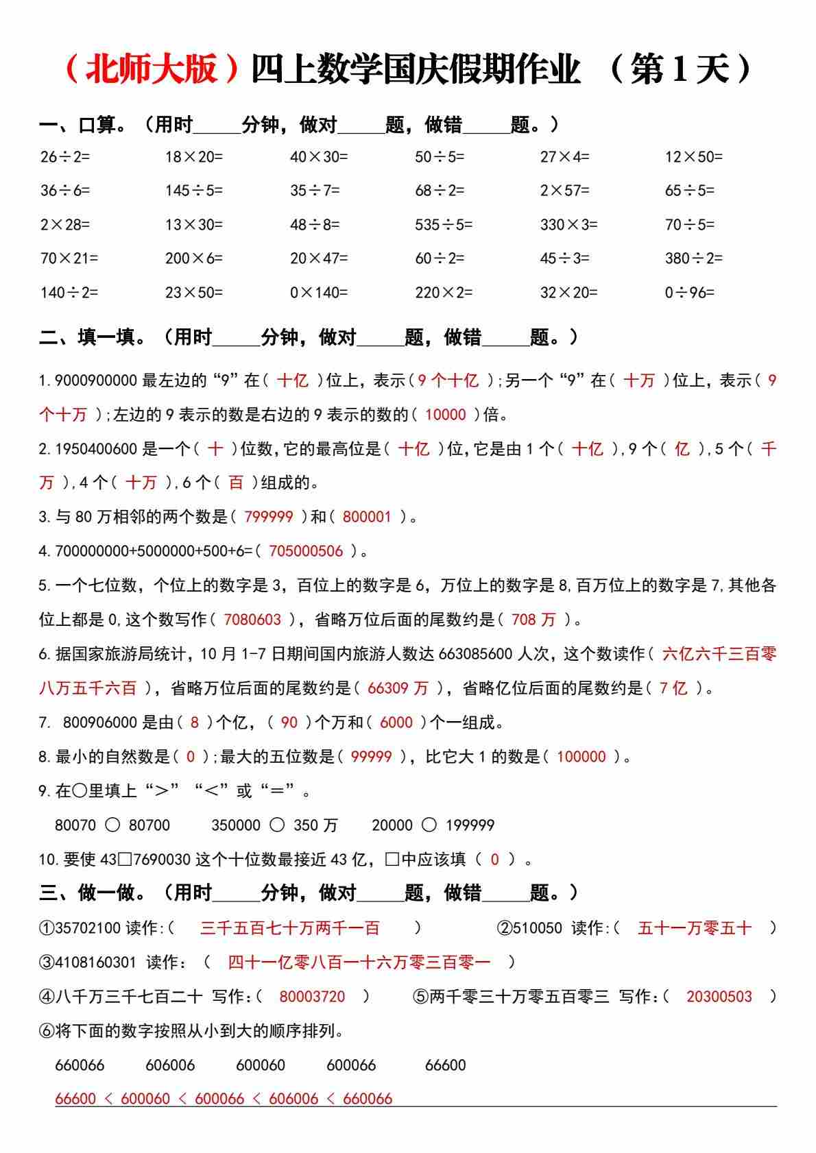 北师大版四上数学国庆假期作业【答案】