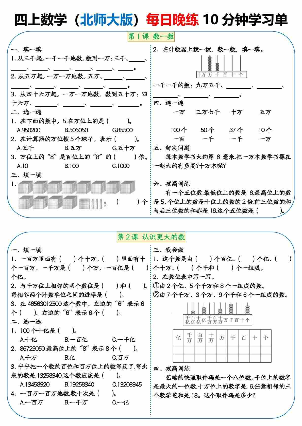 四上数学(北师大版)每日晚练10分钟学习单(无答案)