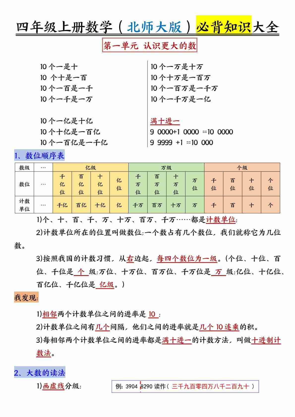 四年级上册数学北师大版必背知识点