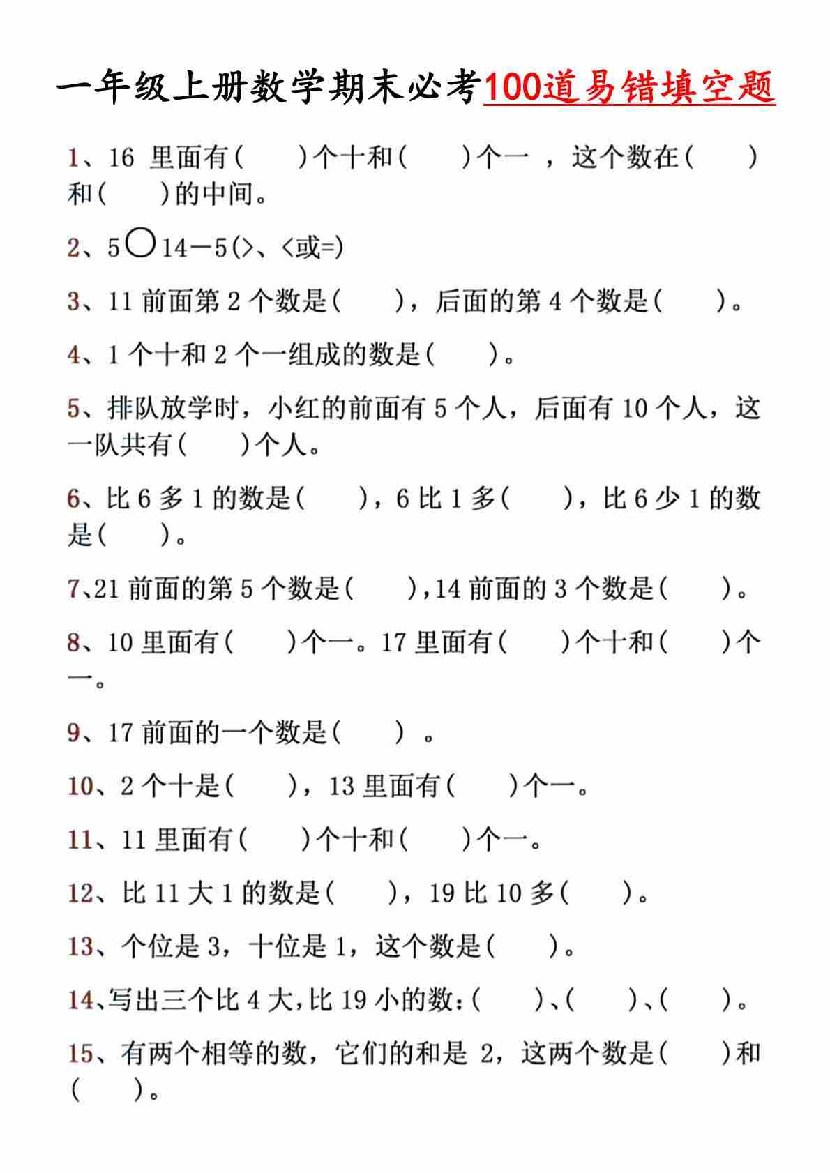 一年级(上)数学期末必考100到易错填空题
