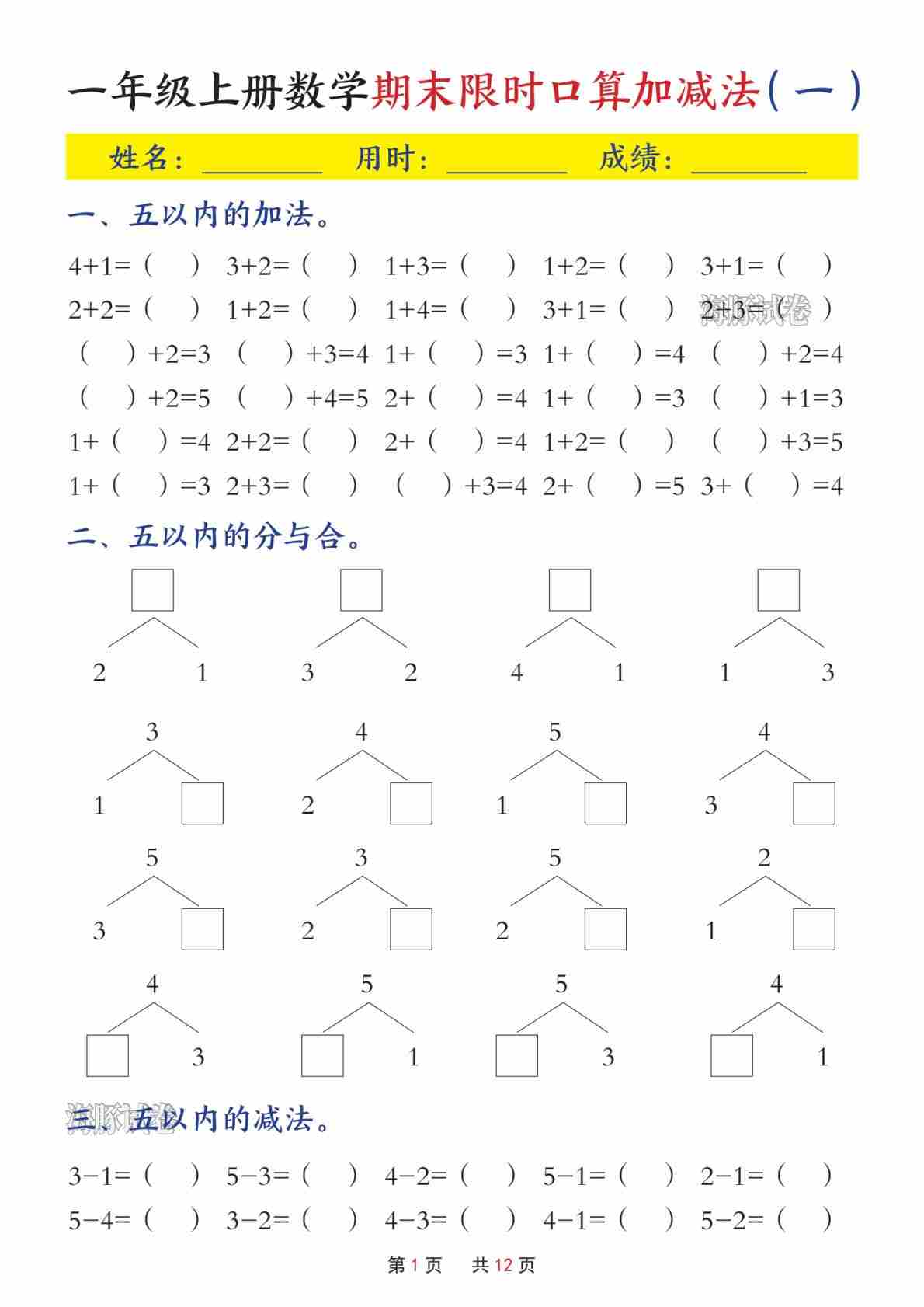 一年级(上)期末限时口算加减法