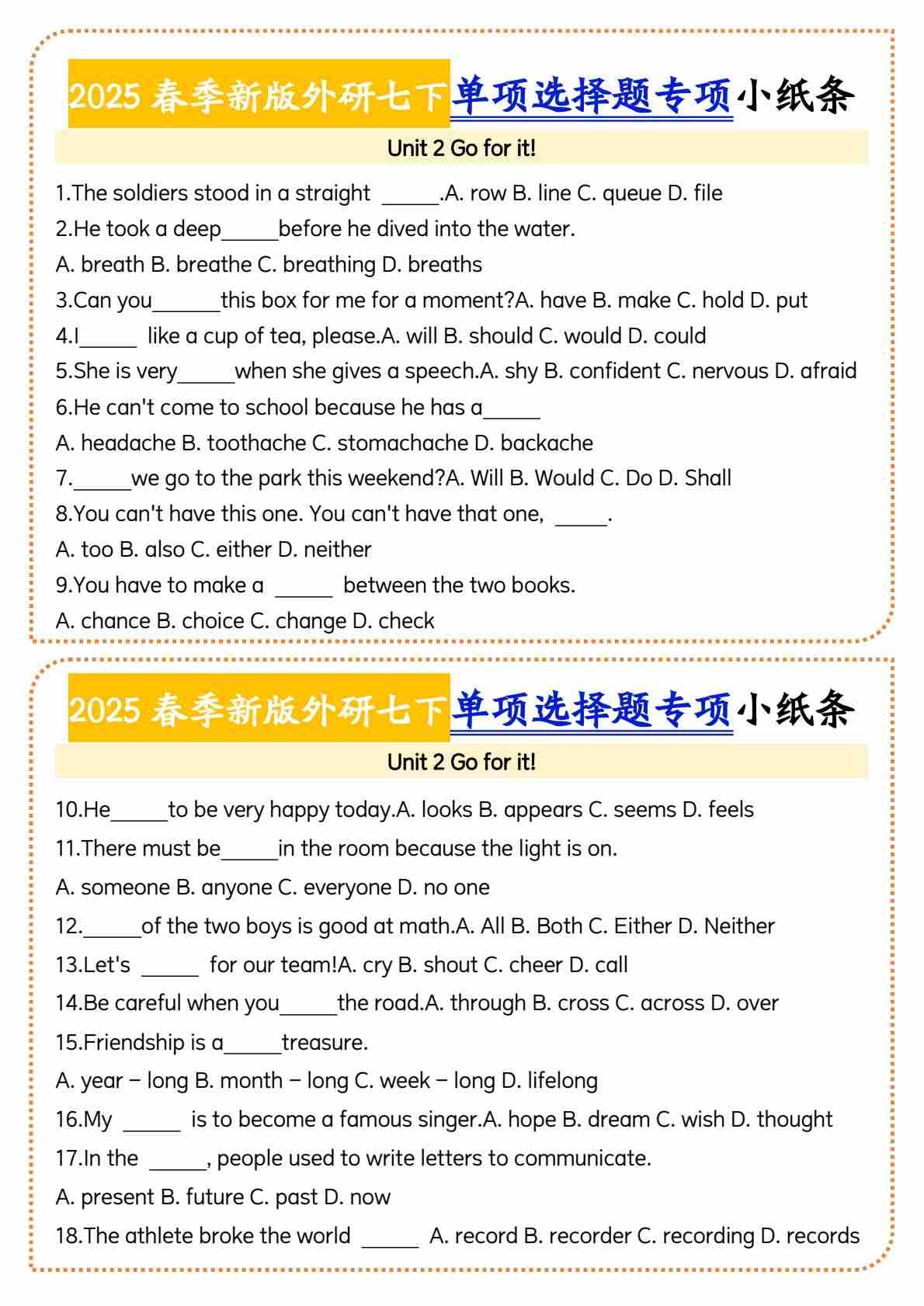 2@2025春季新版外研七下单项选择题小纸条