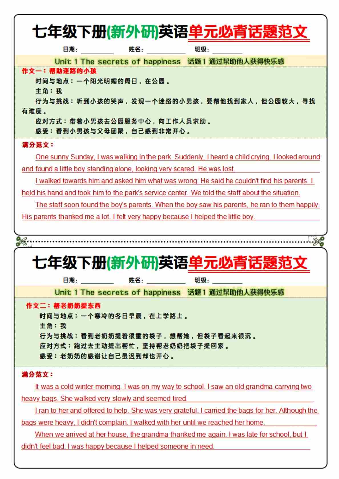 七下(新外研)英语单元必背话题范文