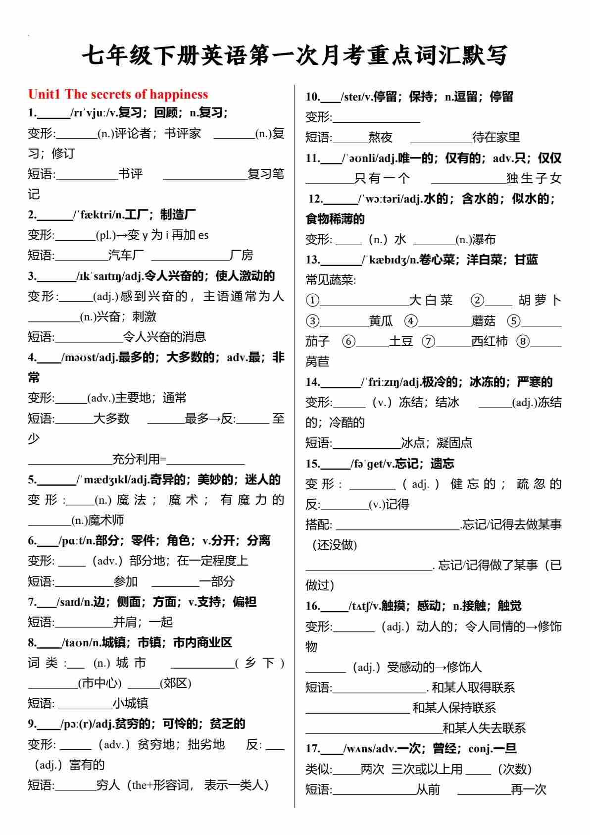 七年级下册英语第一次月考重点词汇默写(外研版)