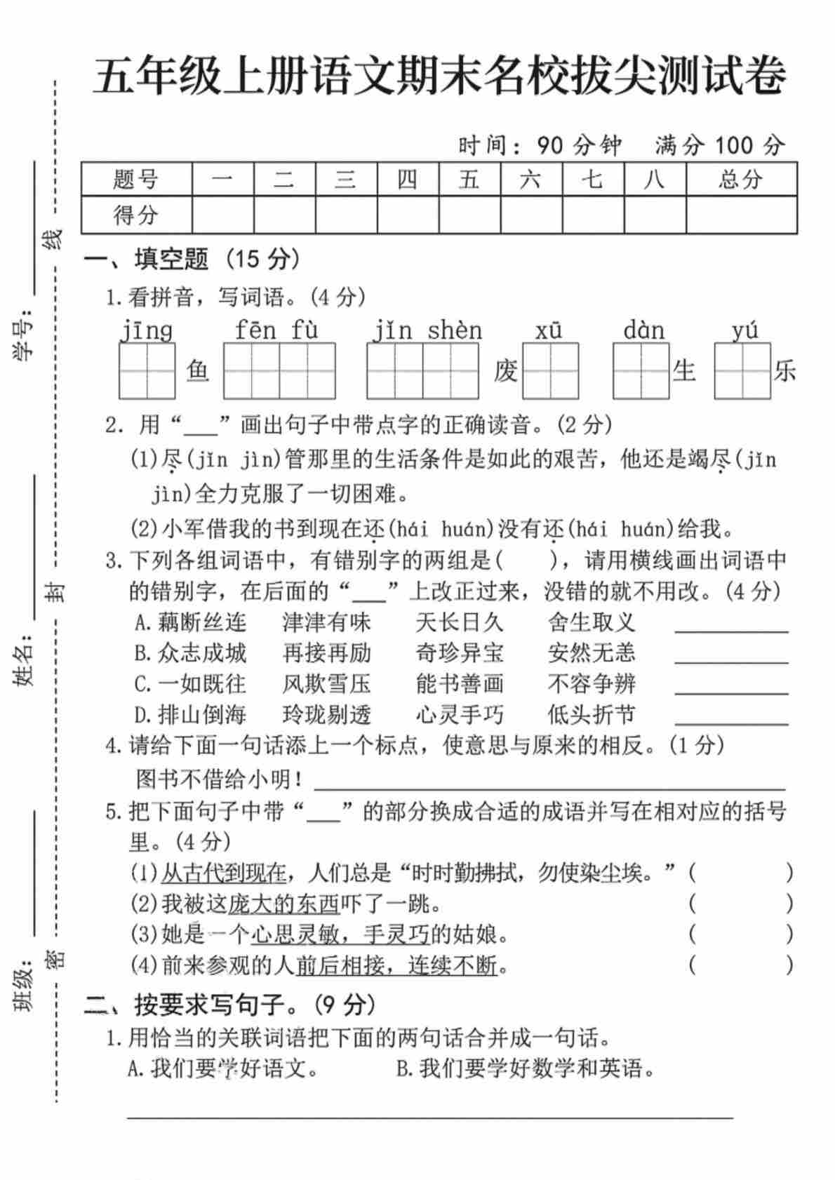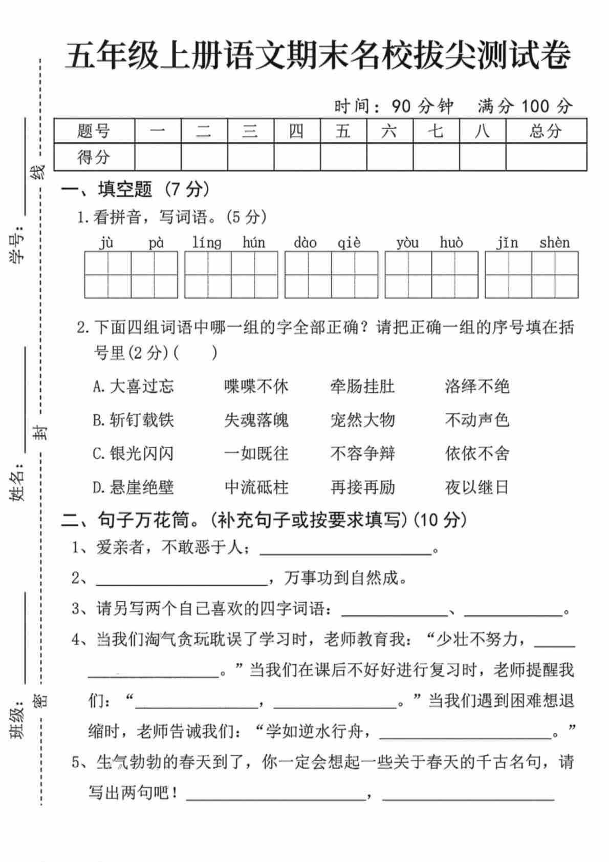 五(上)语文综合拔尖测试卷-ju sang-SY