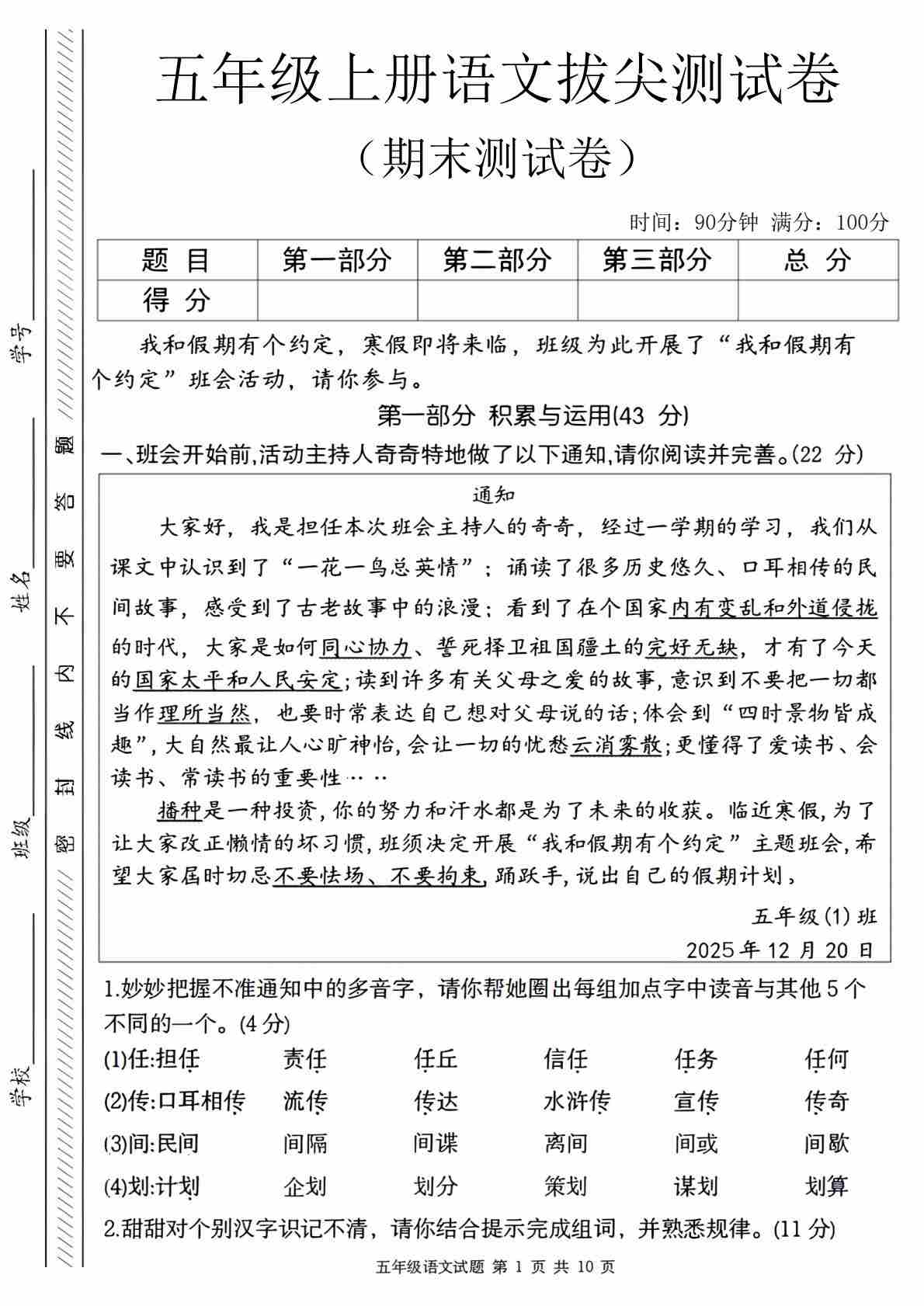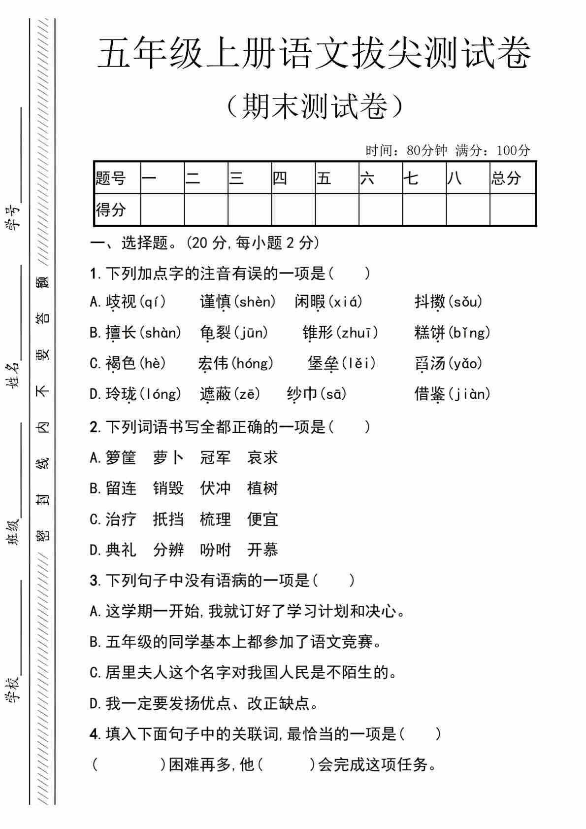 五年级(上)语文 期末拔尖测试卷1