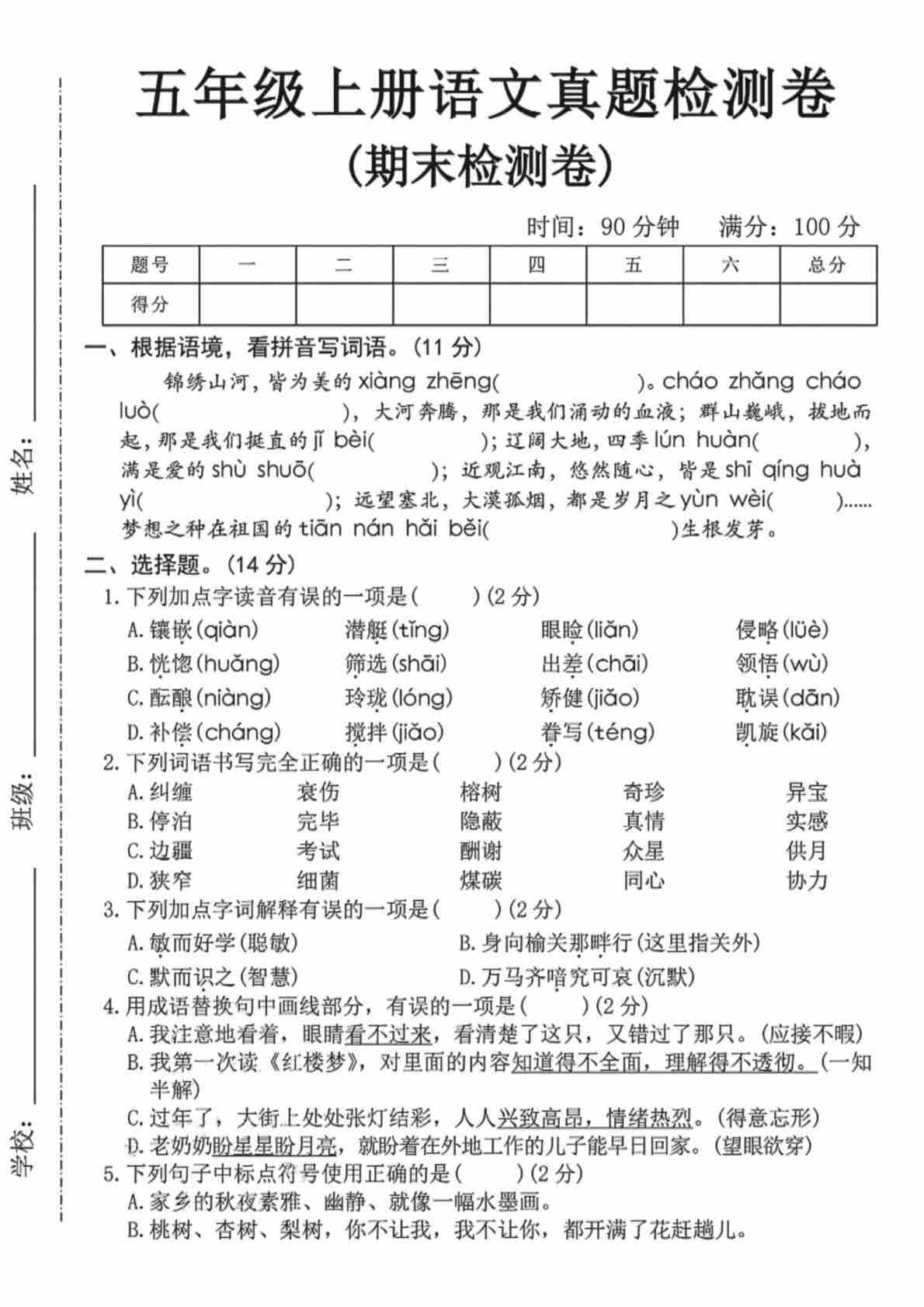 五年级(上)语文 期末名校拔尖测试卷5