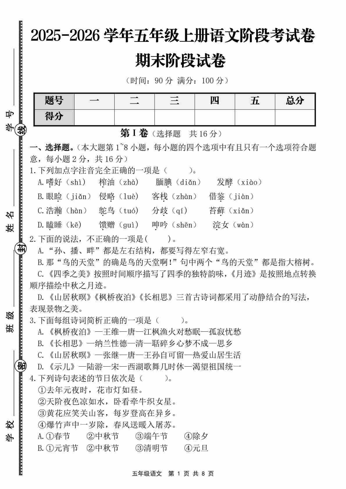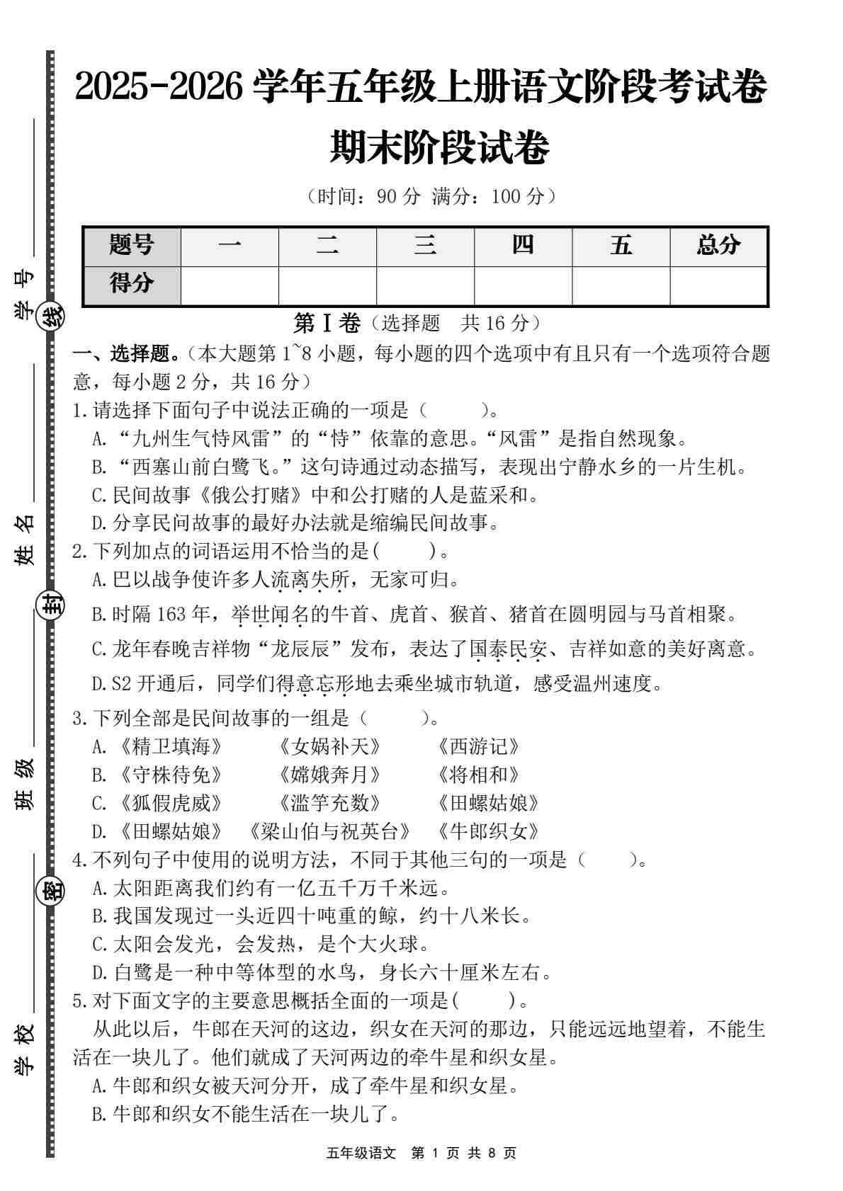 五年级(上)语文 期末名校真题测试卷8