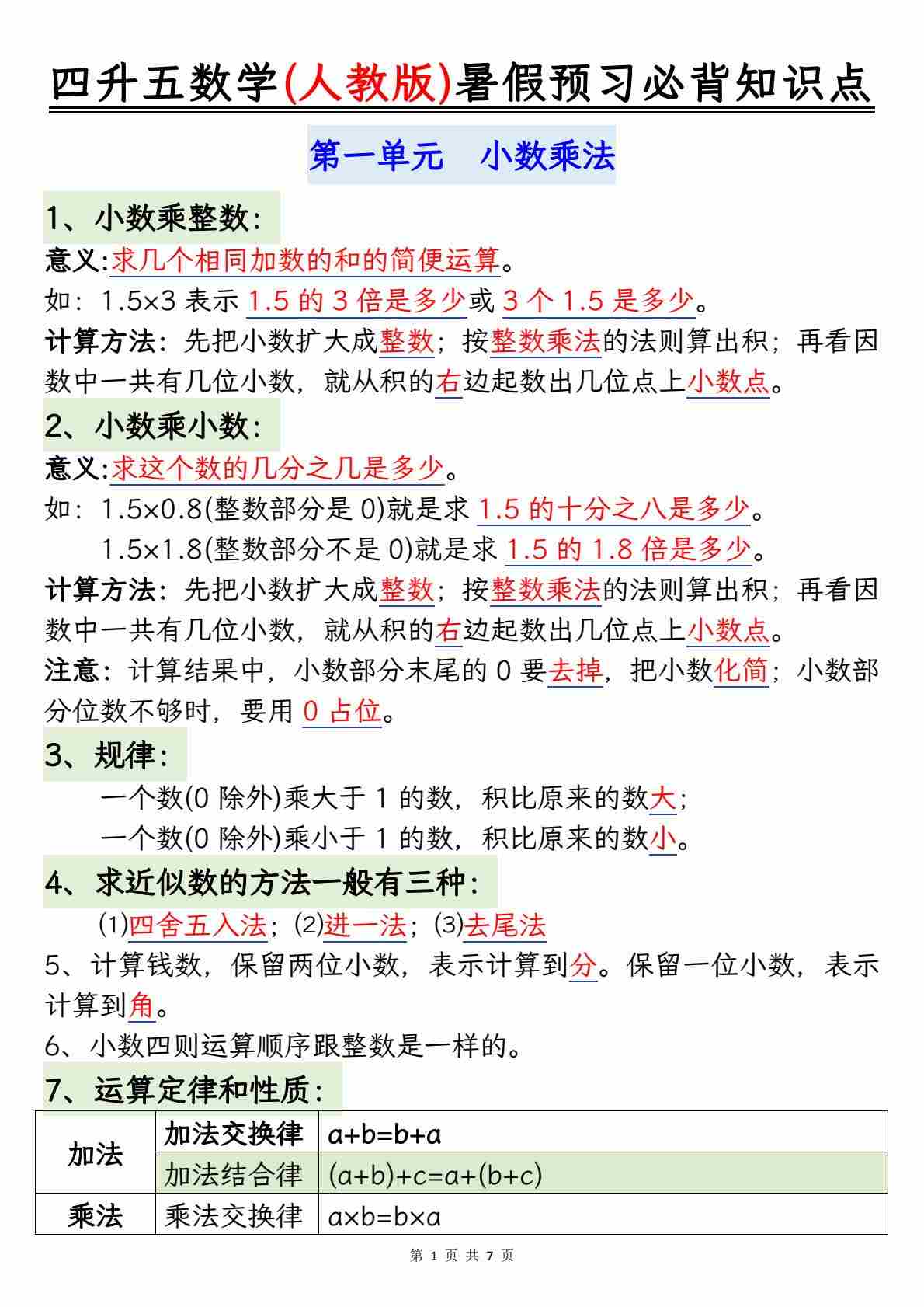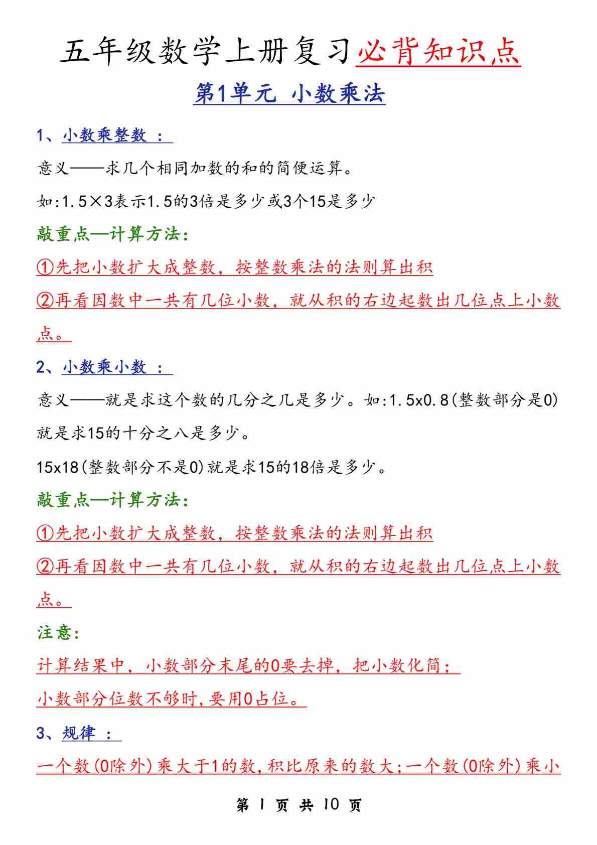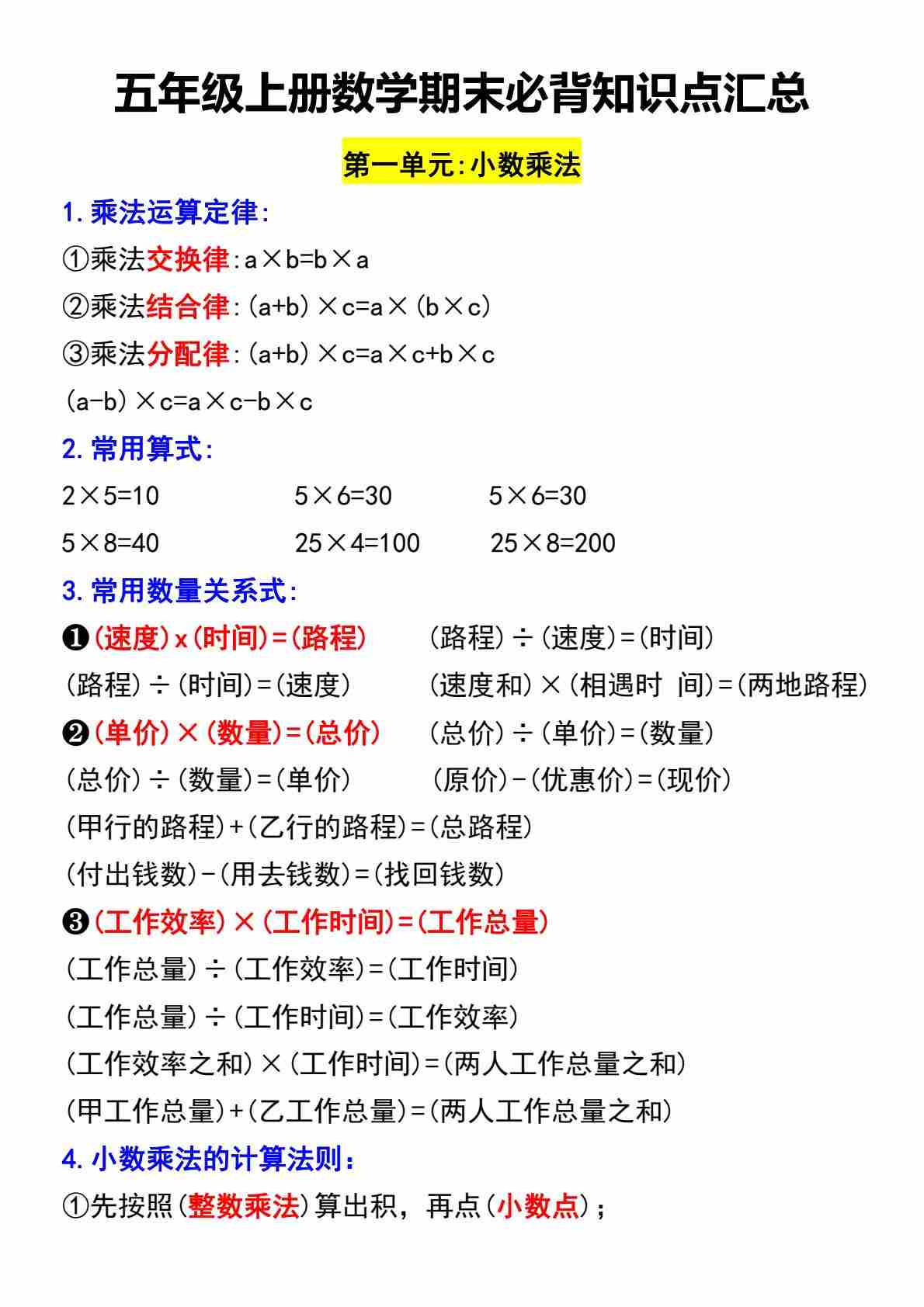 人教版五上数学期末必背知识点汇总