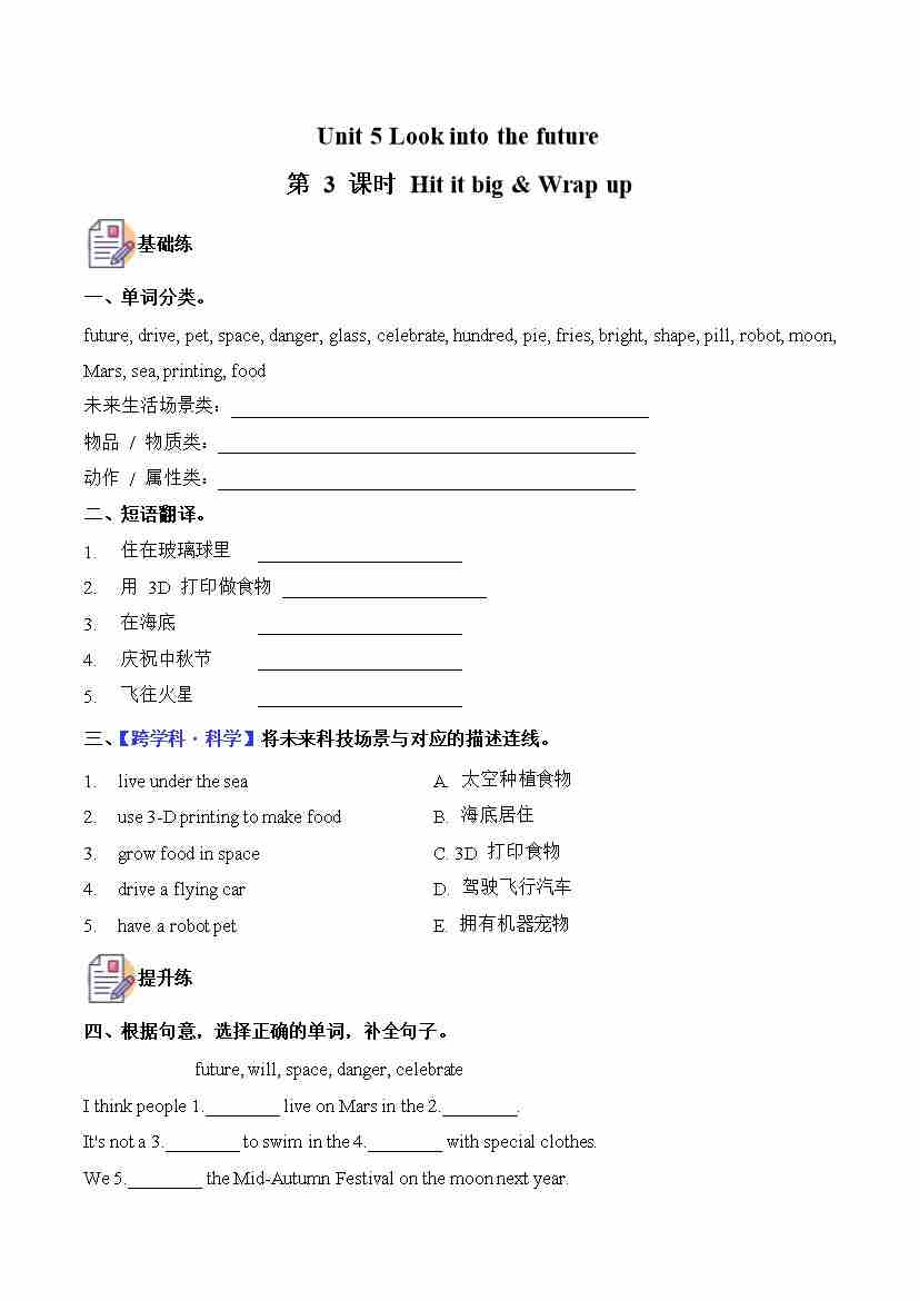五上外研三起Unit 1 第3课时 Hit it big &Wrap up&Let's explore (分层作业)英语外研版三起五年级上册(新教材)3