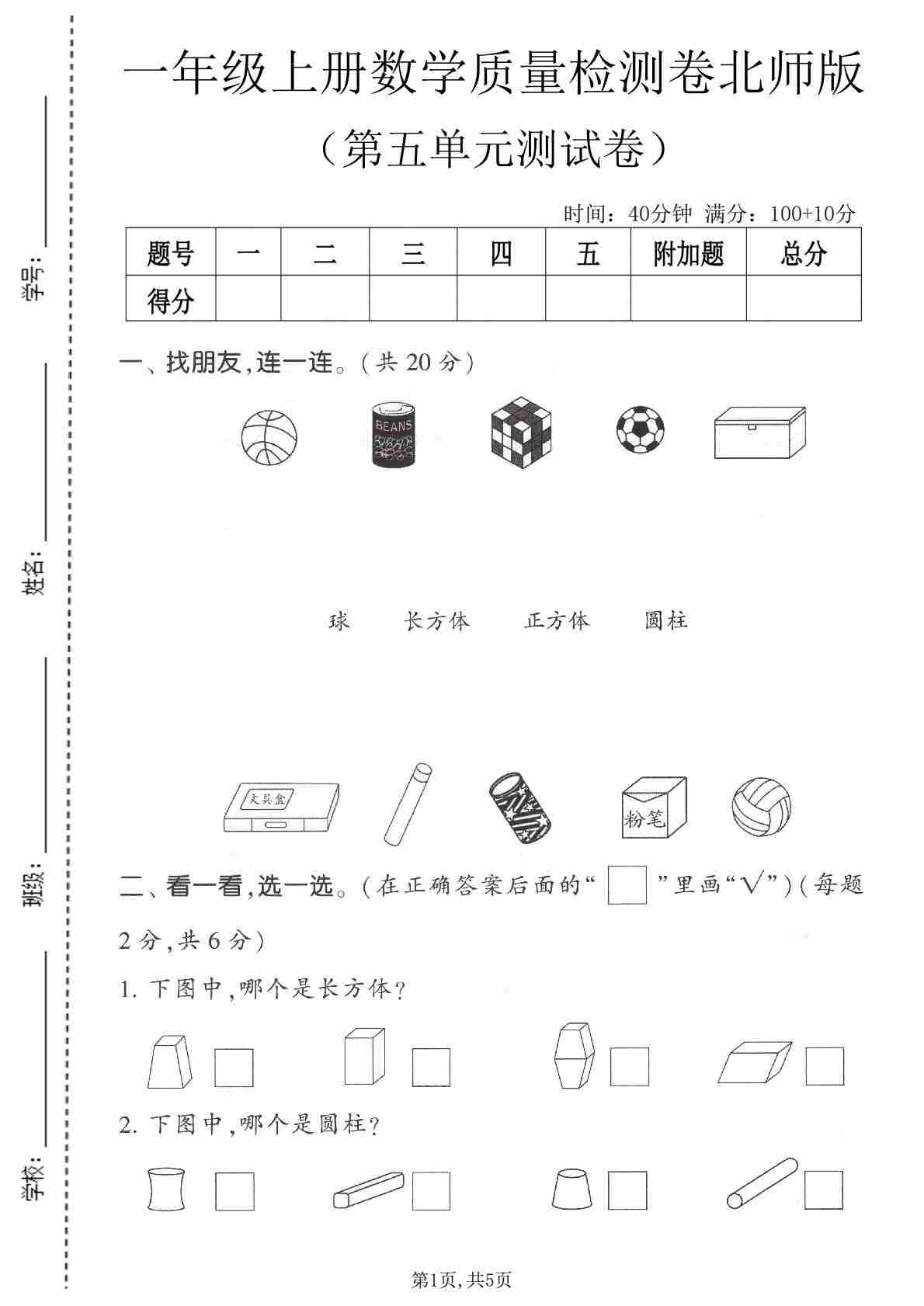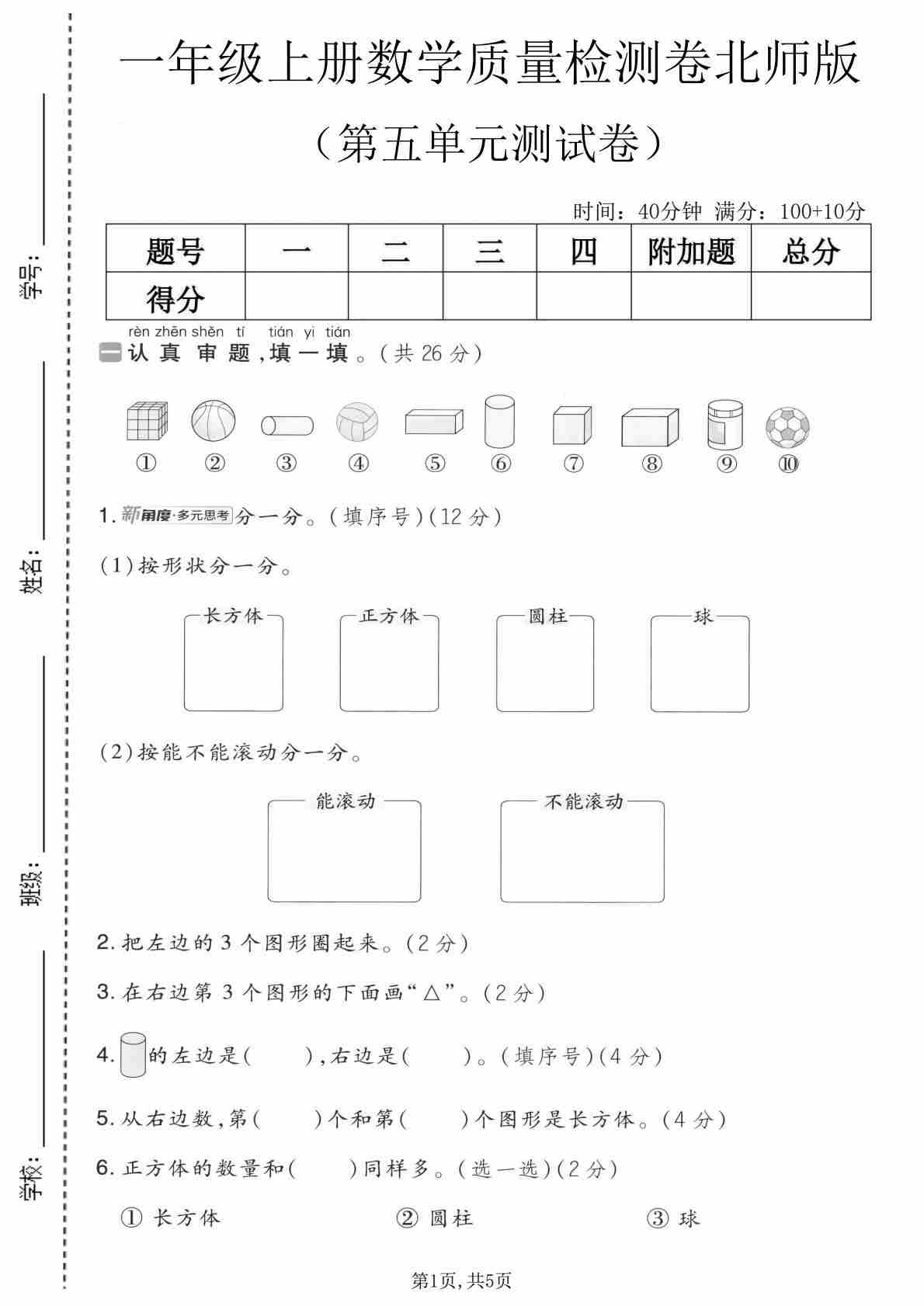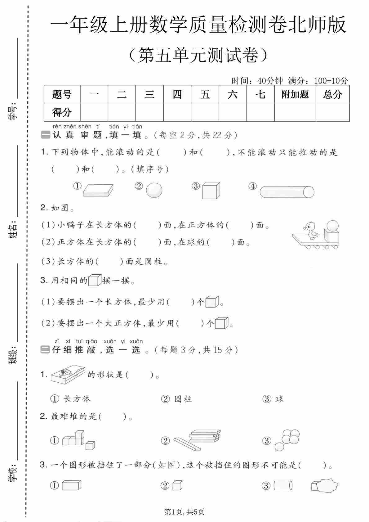 一年级(上)数学 第五单元质量检测卷1《北师版》