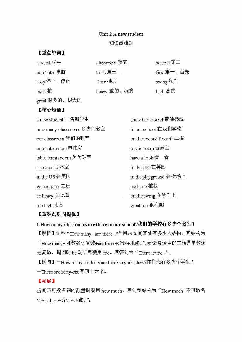 五年级上册英语讲义(梳理 讲解 典例 习题)-Unit 2 A new student 译林三起