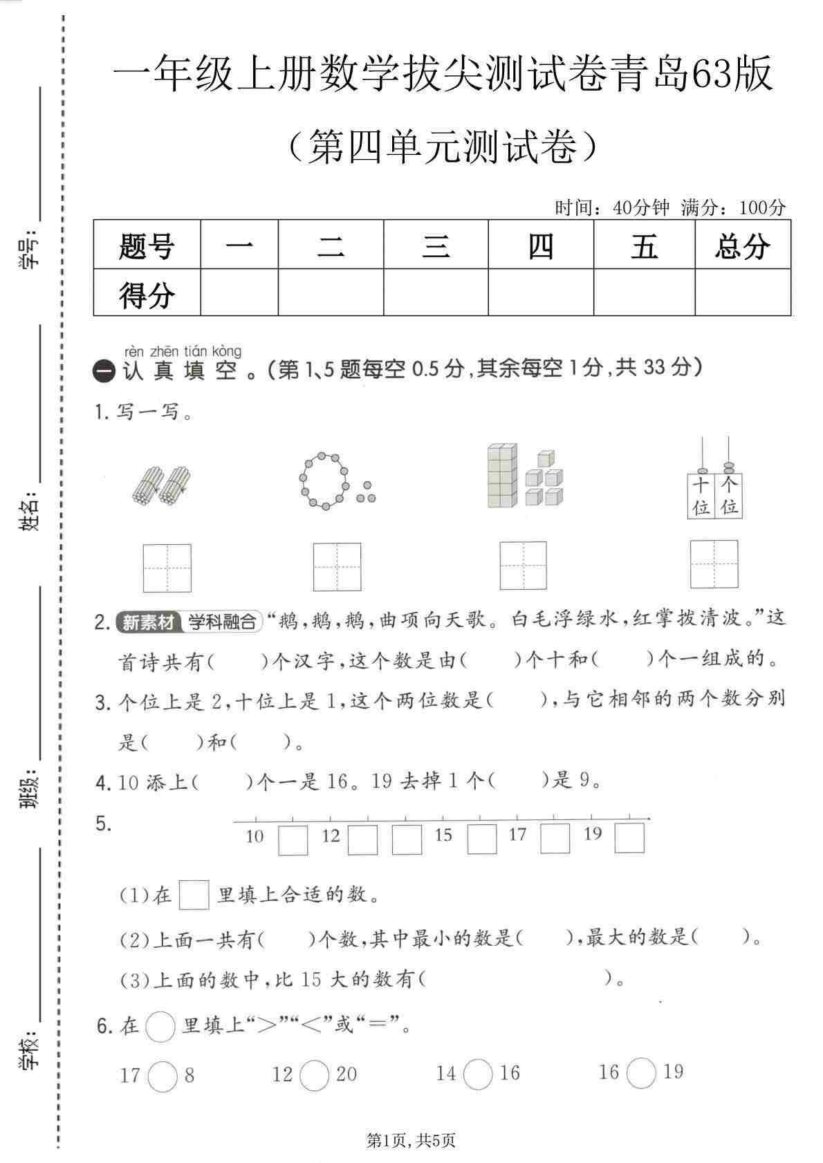 第一单元 1—5的认识和加减法(单元测试)数学一年级上册单元速记·巧练系列(A4版)(青岛六三版)