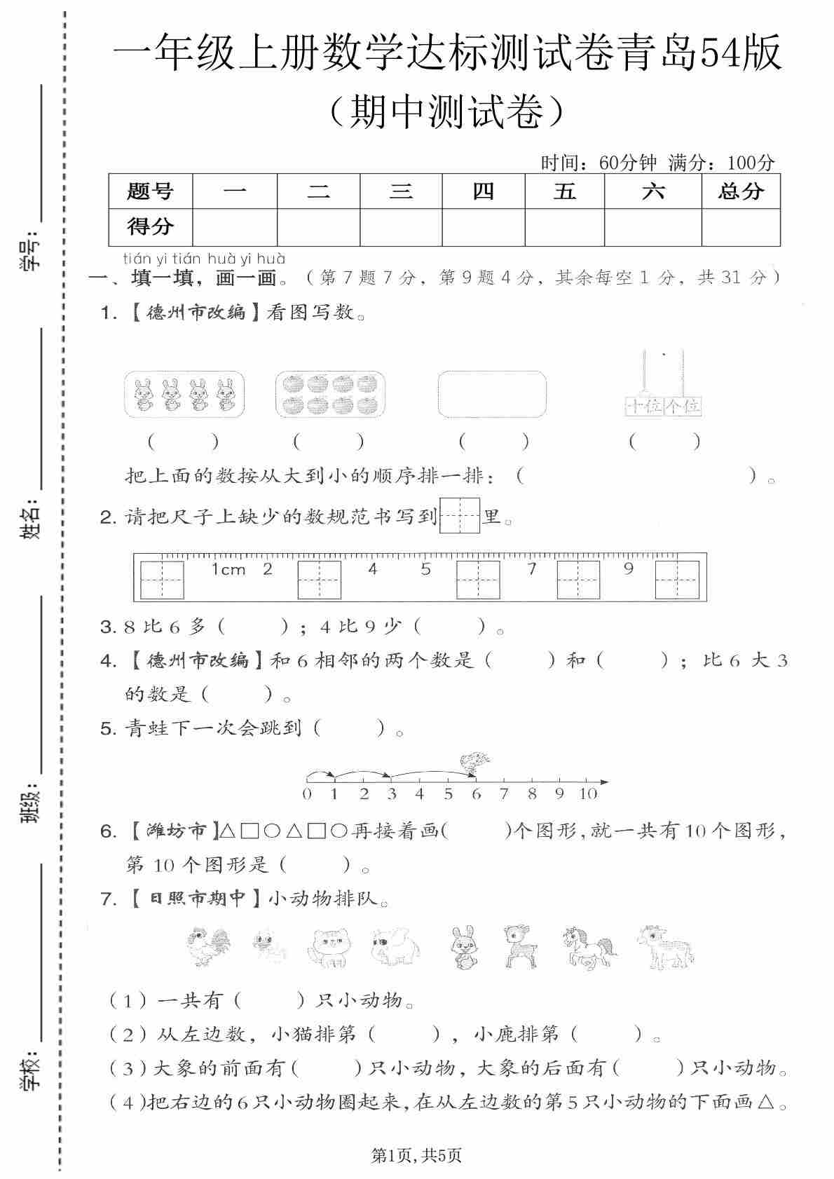 【青岛63数学期中基础卷】25学年一上数学期中素养测评(含答案)17页