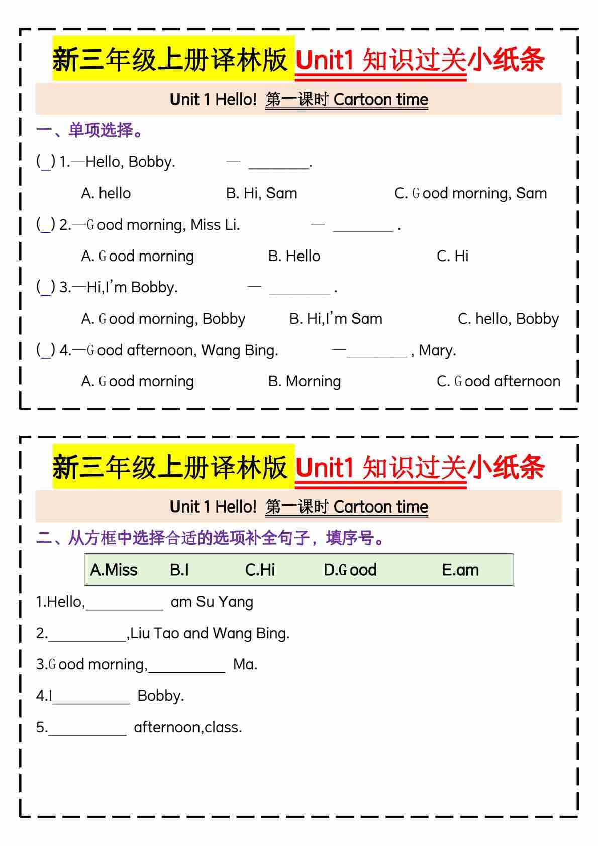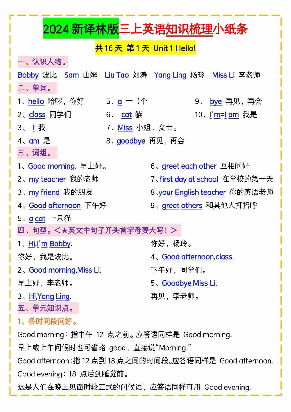 三上译林版unit 1 知识过关小纸条