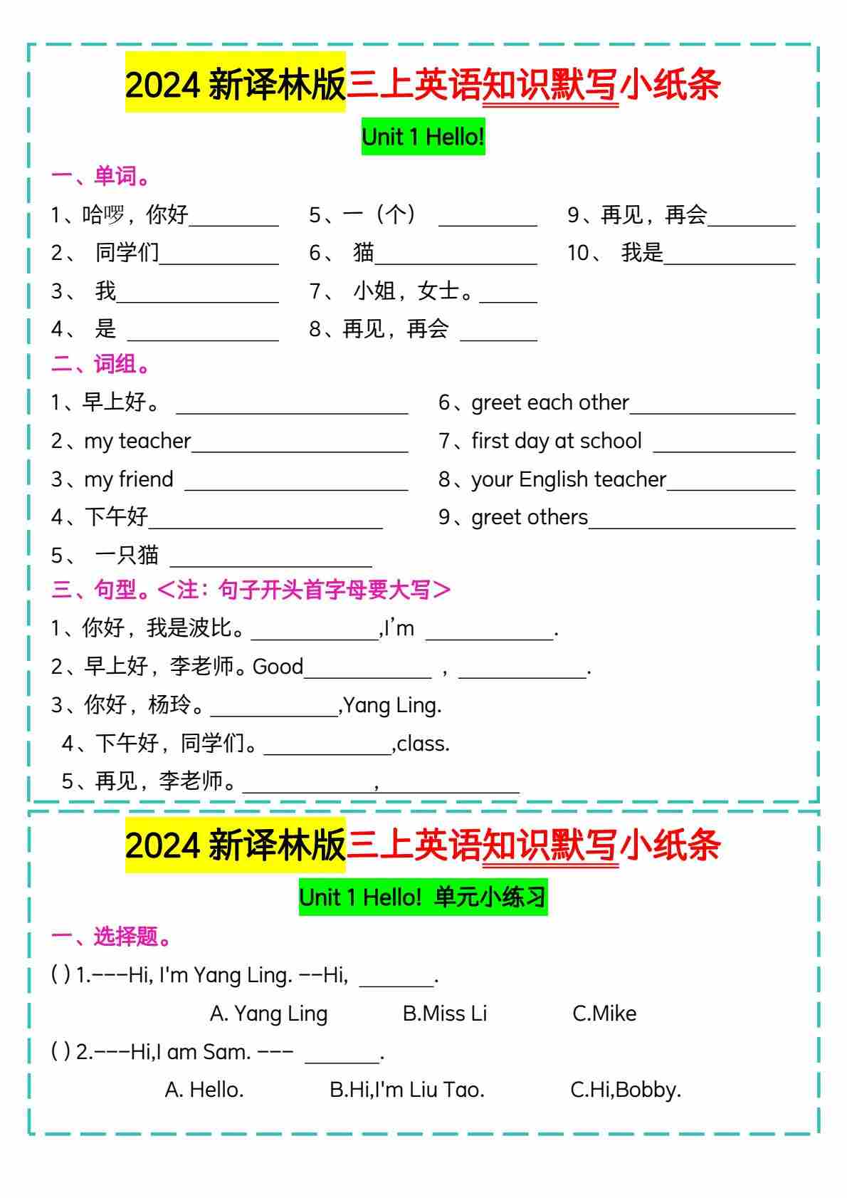 2024新译林版三上英语知识默写小纸条