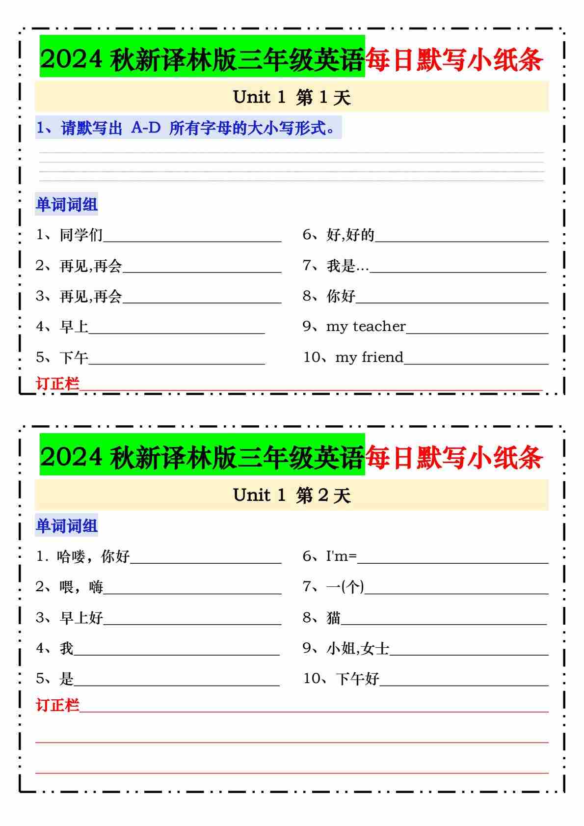 2024秋新译林版三年级英语每日默写小纸条