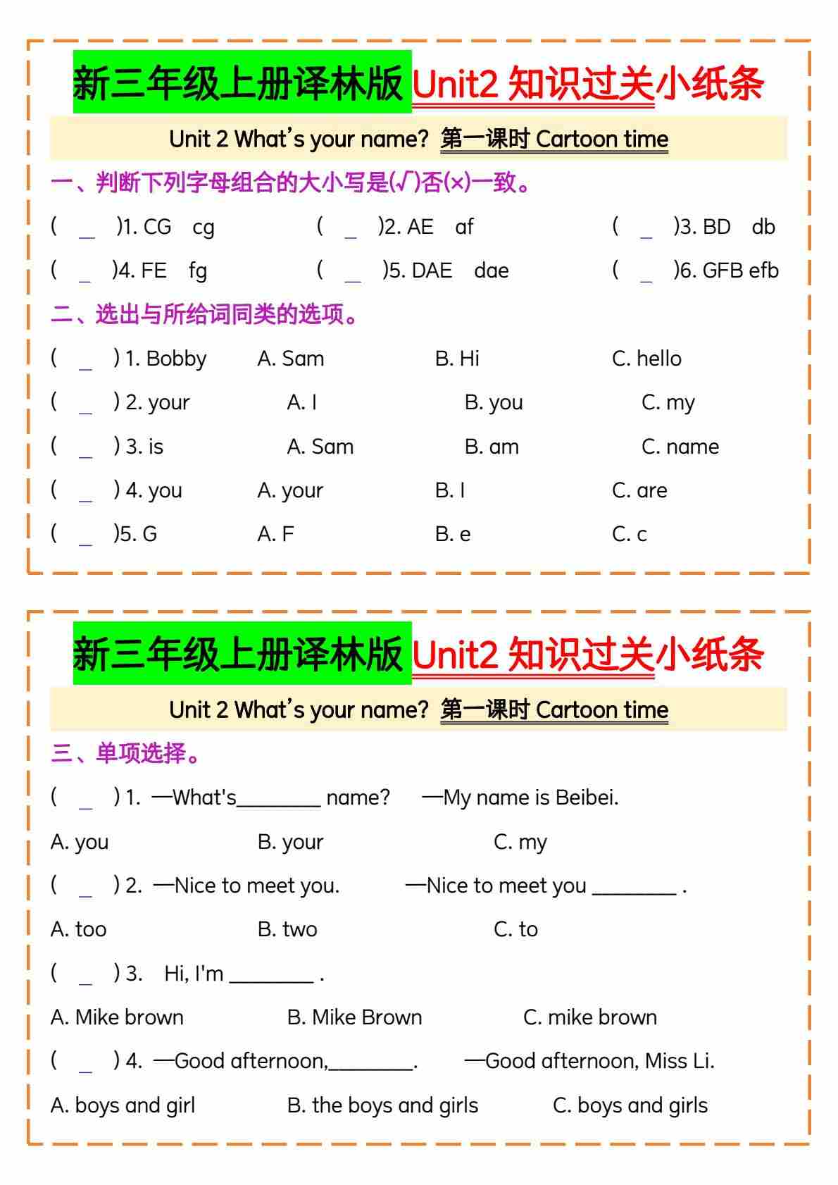新三年级上册译林版Unit2知识过关小纸条